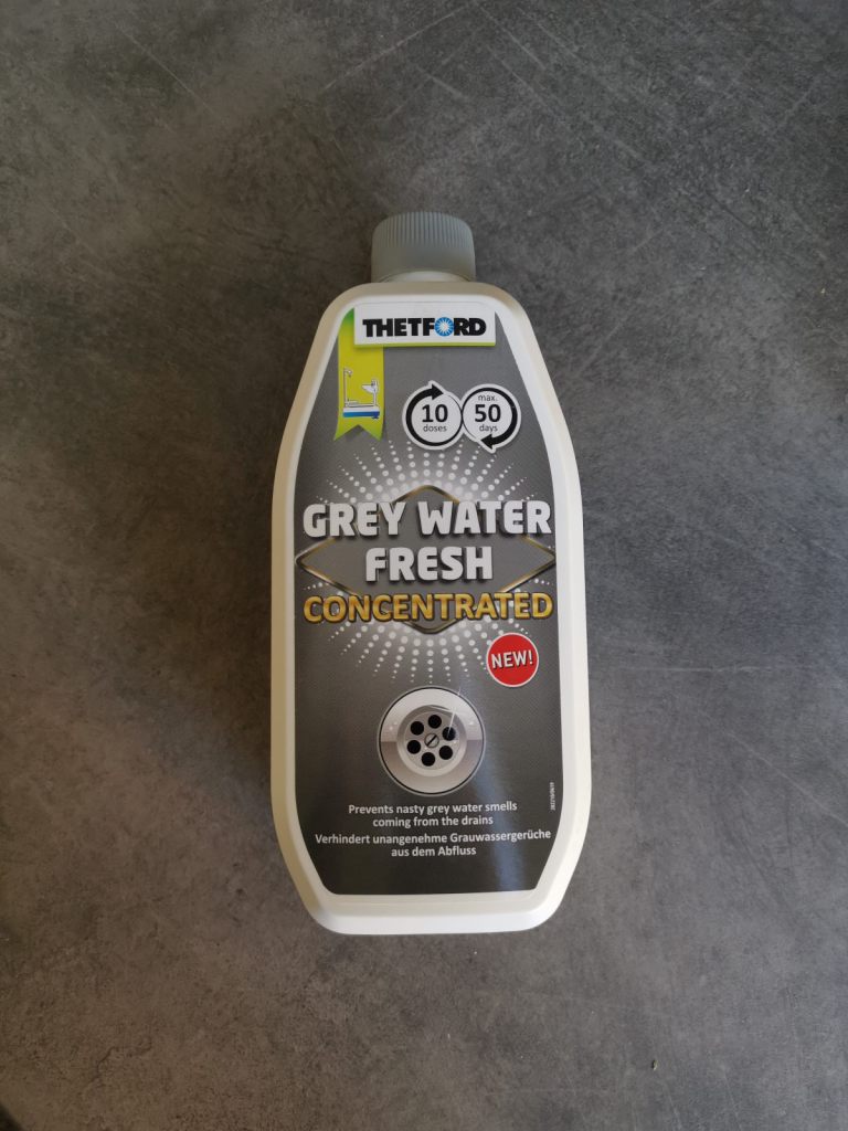 Zápach z šedé nádrže není sice často výrazný, ale občas může potrápit. Snažím se ji tedy udržovat v rámci možností čistou, po každém třetím až pátém vyprázdnění dávám tento přípravek Thetford Grey Water Fresh . Zatím se to docela osvědčilo, i když budou asi levnější metody – četl jsem o pracích prášcích a podobně.