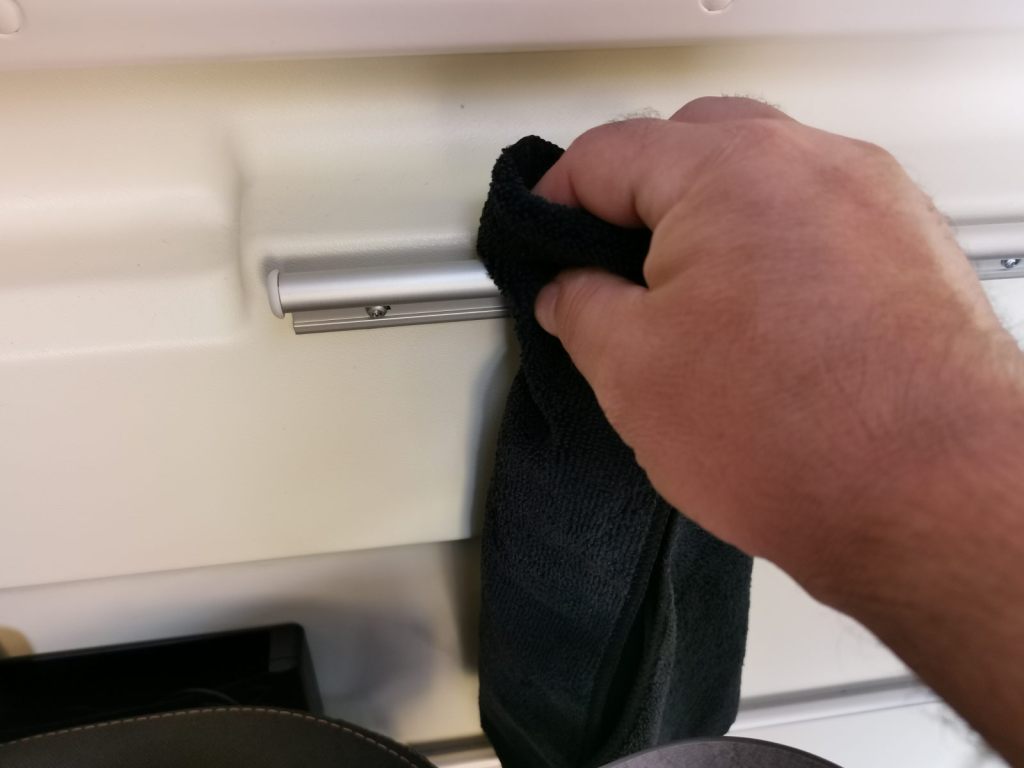 Většina stolků v jídelně je na noze a druhá strana je přichycena do kolejničky ve stěně. Se stolem je díky tomu možná manipulace a úprava jeho polohy buď blíže k zadním a nebo předním sedadlům. Časem si lze všimnout, že posunování stolu již nejde tak snadno. Stačí ale stolek oddělat, na hadýrku stříknout známé mazadlo WD-40, a lištu hadříkem utřít. Případně, pokud je lišta špinavější, napřed očistit a pak doleštit tím nastříknutým hadříkem.
