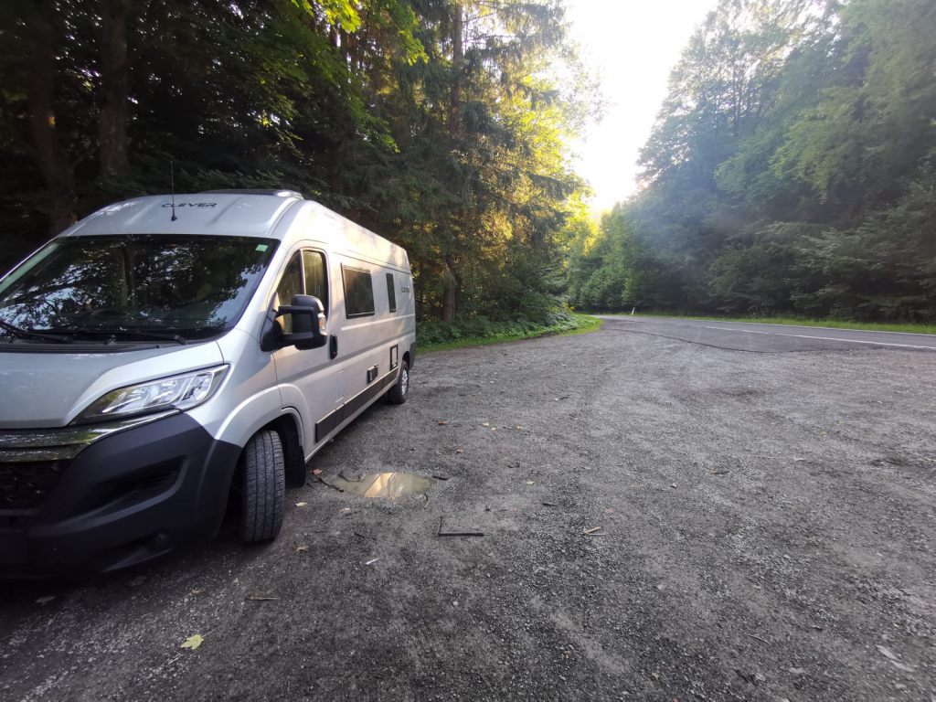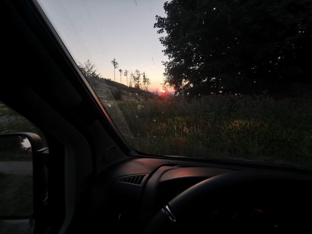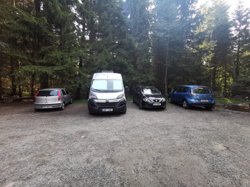 My ale pokračovali dále směrem Zlaté Hory a parkoviště pod Biskupskou rozhlednou. Parkoviště je velké, s výhledem na západ slunce. Rovných míst je zde několik. A drobná rada – jsou tady vlastně parkoviště dvě, jedno hlavní, a kousek pod základy jakési bývalé stavby, pak i malé. Spíše taková loučka. Zde naleznete více soukromí a budete mimo přímý dohled z velkého parkoviště. Ale my parkovali na tom velkém. Menší není pořádně vidět, ale je ve směru na Petrovice.