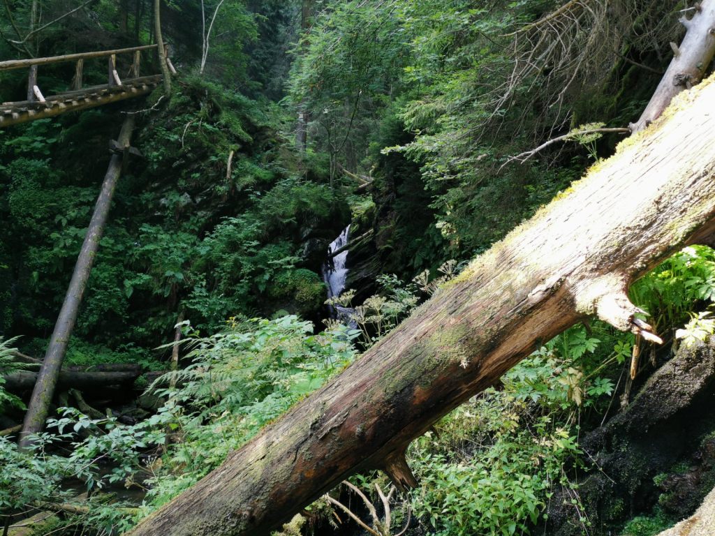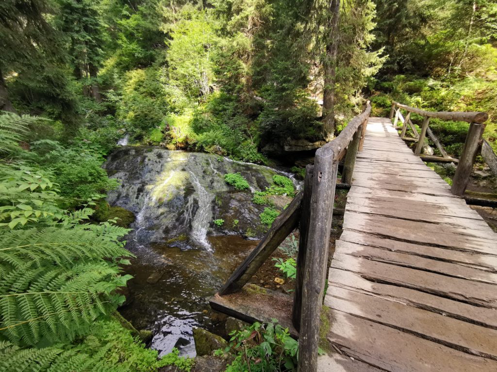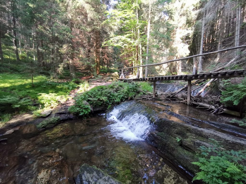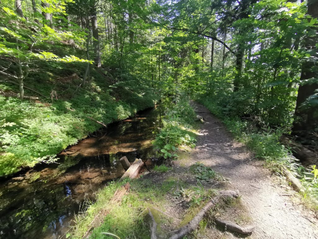 A pokud se nechcete vracet zpět stejnou cestou, je možné přejít na druhou stranu a lesní cestou se vrátit k hlavní silnici. Jen je potřeba počítat s tím, že tato cesta je místy docela podmáčená a k tomu i obstojně zarostlá. Výhledy na potok jsou omezené, ale zase zde není ten již zmíněný asfalt. A samozřejmě jde pokračovat i delším okruhem po původní cestě – fantazie se meze nekladou.