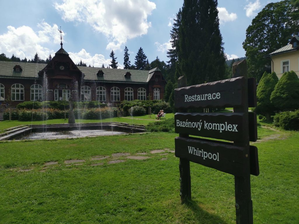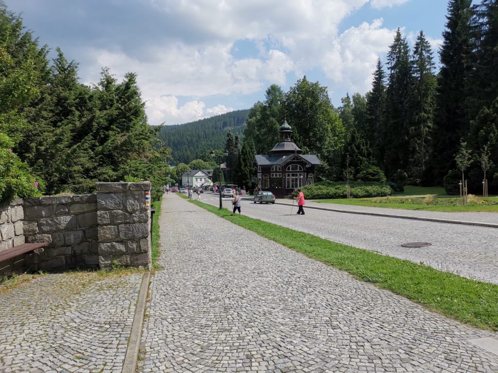 Kolem přeplněného parkoviště u Hvězdy jsme sešli do Karlovy Studánky, celou si ji prošli a prohlédli. Ostatně není to kdovíjak rozlehlé lázeňské místo. Hlavní silnici lemovalo o víkendu několik stánků, ochutnat šlo i lázeňský pramen. K parkovišti jsme se pak vrátili výstupem na lázeňskou cestu a kolem náhodu pro lázeňský vodopád prošli pěkně horem zpět k parkovišti.