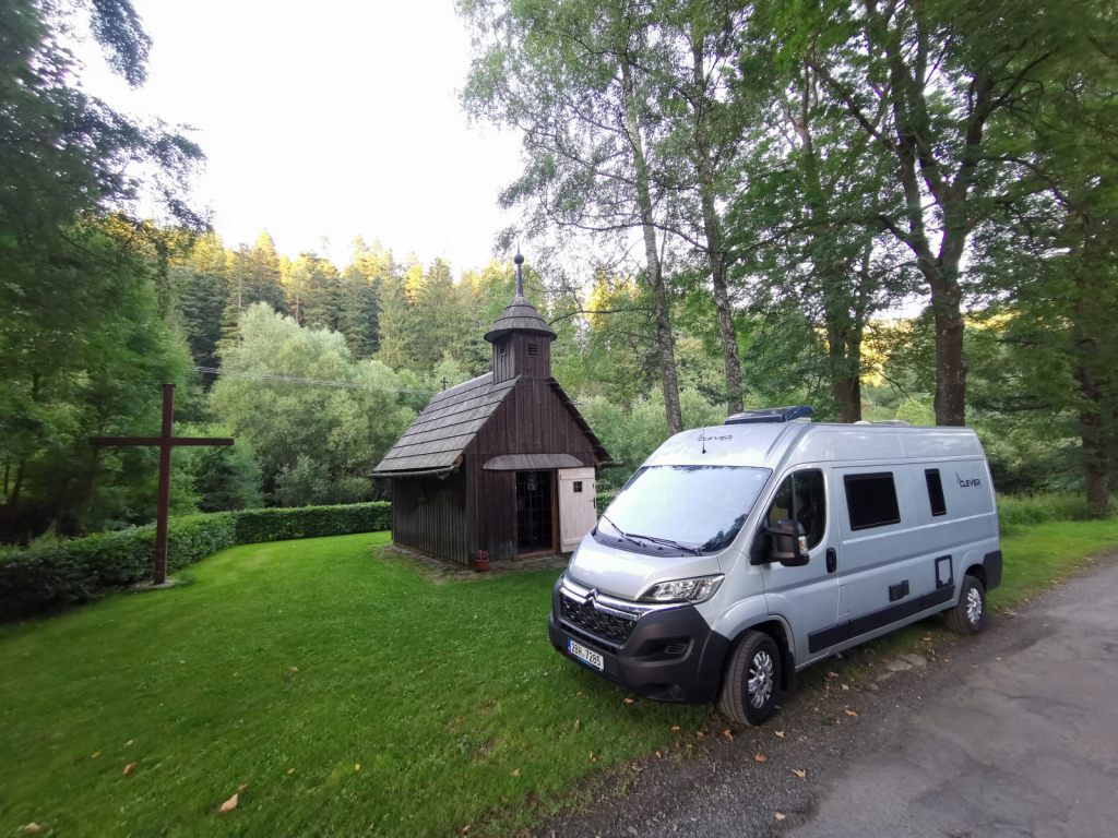 To jsme ale již byli dávno pryč, pryč i z parkoviště a vlastně o kus dále, na velkém parkovišti u kostela Marie Pomocné nad Zlatými Horami. Před dvěma lety jsme tady nocovali a tohle místo je na divoké kempování přímo stvořené – rozhlehlá a rovná asfaltová plocha by pojala daleko více než jen naše auto. I když tentokrát zde bylo poměrně plno, byla pouť. Ale i tak pořád nějaké místo zbýval. Parkoviště je pak ideálním startovacím bodem pro okružní cestu po bývalých zlatorudných dolech. Mimo pohledů do nitra starých dolu jsou zde i výhledy do okolí – na Zlaté Hory, tak do polské roviny.