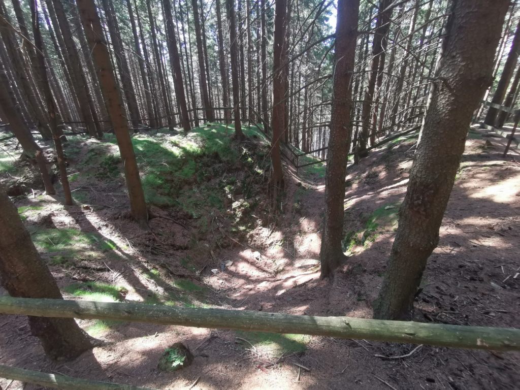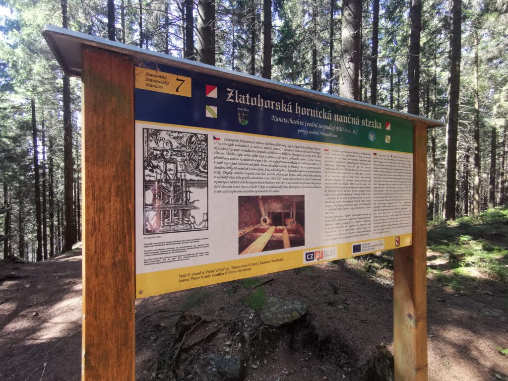 Pozůstatky středověkých dolů jsou stále patrné a v části naučné stezky se smí z důvodu poddolování chodit jen po úzkých a pečlivě ohraničených cestách. A z nich do hloubky bývalých dolů opatrně nahlížet. Vše doplňují cedule vysvětlující, jak se dříve zlato dobývalo. I kolik ho bylo. Po stezce obkroužíte celý kopec s názvem Příčný vrch. Po cestě sice není žádné klasické občerstvení, zato hodně borůvek a malin.