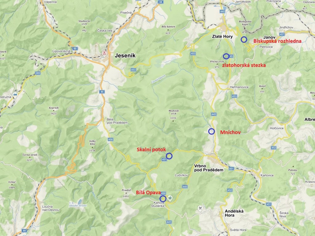 Další z mnoha víkendových toulek po Jesenicku. Tentokrát s obytným vozem do Karlovy Studánky, výlet údolím Bílé Opavy, kolem Skalního potoka, návštěva kapličky v Mnichově, výstup k Biskupské rozhledně i toulání po zlatohorské hornické cestě.