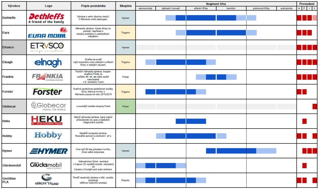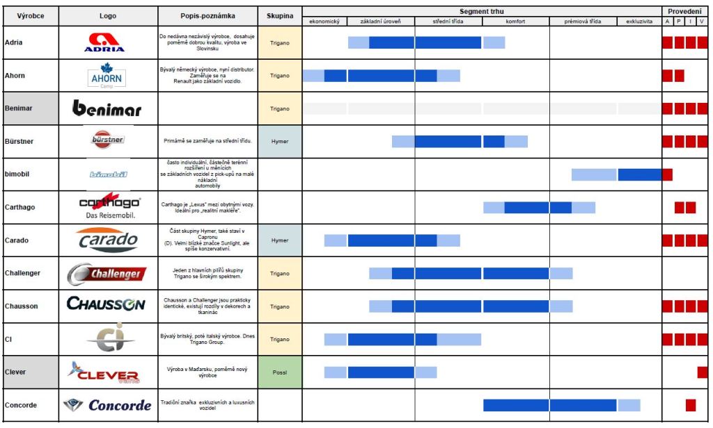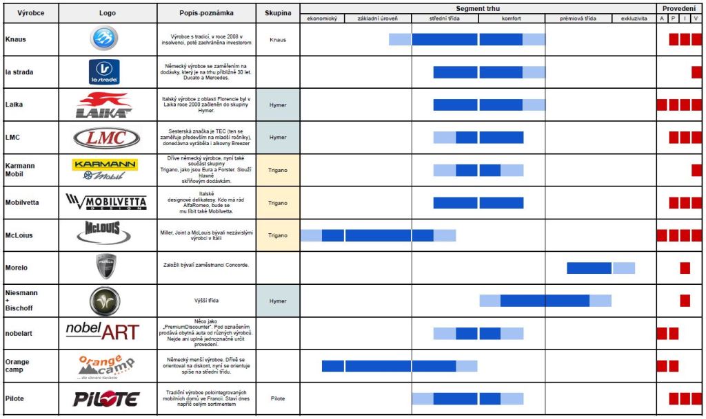 A tady je slibovaný přehled, méně výrazná barva znamená, že výrobce je sice v daném segmentu zastoupen, ale ne tak silně jako v ostatních. Připojen je i stručný přehled provedení obytného vozu nabízeného pod danou značkou. Význam zkratek: