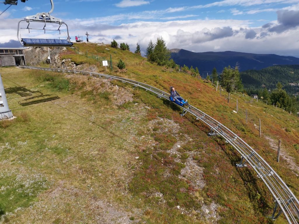 Netřeba předstírat, že je to oblíbená destinace i v létě a podle toho to zde vypadá. Lidí poměrně dost, parkoviště před hotely plné a v provozu jsou hned dvě lanovky. Jedna ve Štýrsku, druhá v Korutanech – hranice mezi těmito dvěma spolkovými zeměmi probíhá tak nějak uprostřed průsmyku a osady. Lanovka v Korutanech je zahrnuta do korutanské karty (detaily o kartě v článku Korutanská karta a obytný vůz jdou perfektně k sobě), ta ve Štýrsku zahrnuta není. Ale zaveze výše. Dráha na korutanské straně, Panoramabahn, jezdí z 1.789 metrů do 1.978 metrů a na 650 metrech překoná 190 výškových metrů. Zpět je možné jet lanovkou a nebo se svézt bobovou horskou dráhou. Cena bez korutanské karty je €15 a to za zpáteční jízdenku.