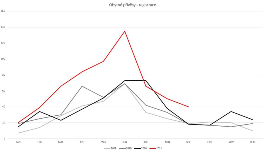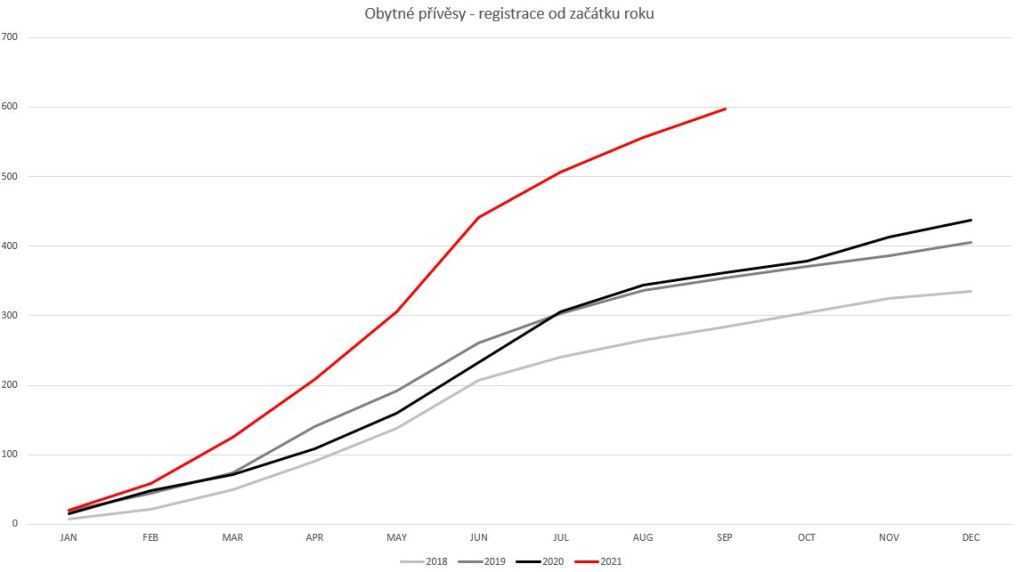 Jak je vidět, je nárůst v porovnání s minulými roky dvojnásobný, u obytných vozidel se dokonce registroval více jak trojnásobek vozidel v porovnání s rokem 2019.