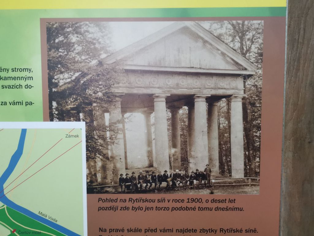 Po jeskyni lze z hlavní cesty kolem vrchu odbočit a podívat se na zříceniny Rytířské síně. Opět to není žádná památka dávných dob, byla to romantická stavba v podobě antického chrámu někdy z první poloviny 18. stoleté. Jen byla v roce 1910 zničena vandaly a zachoval se jen jeden jediný sloup.