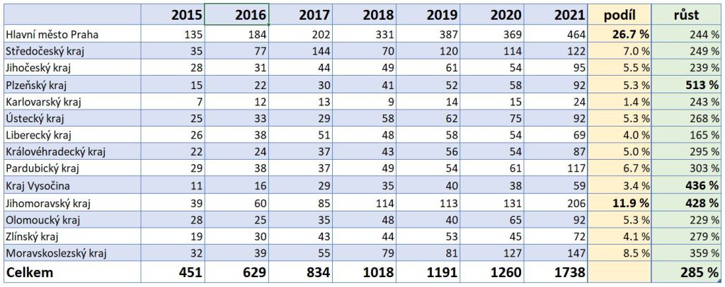 Ovšem pokud srovnáme růst mezi lety 2015-2021, tak Praha mezi premianty rozhodně nepatří, roste podprůměrně (to je mimochodem vidět i na poslední tabulce v článku). Naopak třeba v Plzeňském kraji vzrostl počet registrací o více jak 500 %, v kraji Vysočina o 436 % a Jihomoravský kraj si polepšil o 428 %. U prvních dvou je to ale dáno spíše celkově menšími počty registrací, ovšem Jižní Morava je jiný případ, zde došlo k růstu z 39 kusů na 206 nových obytných aut.