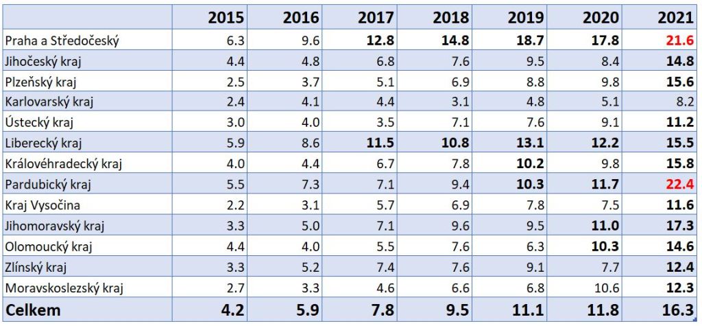 podíl – podíl kraje na celkových registracích v roce 2021 (bez období říjen-prosinec)