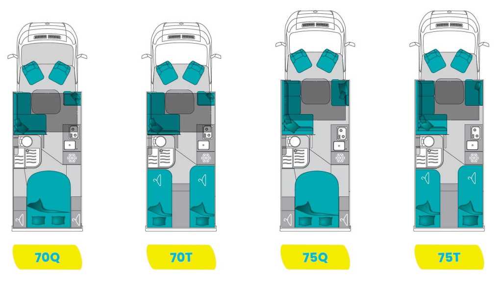 4 modely jsou dostupné ve dvou délkách – takže dva modely se vejdou do 6.99 m a zbývající dva do 7.3 m. Všechny jsou shodně vysoké 2.85m, stejně tak i šířka je stejná, 2.3m. Hlavní rozdíl je vždy vzadu – nabízí se buď provedení s francouzskou postelí a nebo dvěma samostatnými podélnými lůžky. Za příplatek je také možné získat rozkládací spaní pro další dvě osoby v přední části vozu. Ale lůžko zde vznikne rozložením sedací části, stahovací postel zde nehledejte. Tedy je vlastně dostupná jen za příplatek.