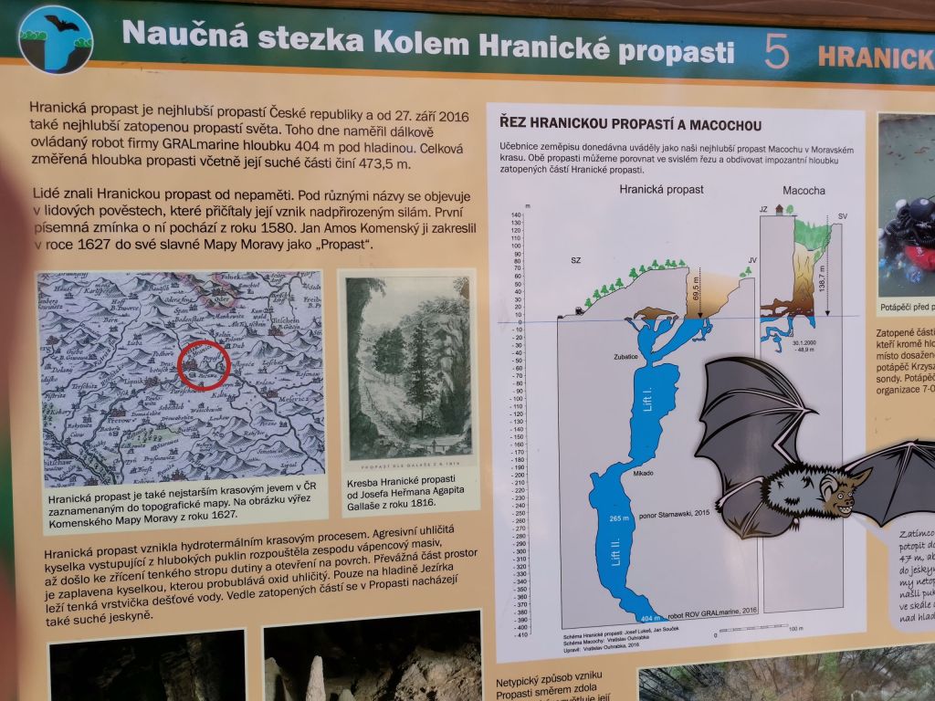 Po prohlídce jeskyní lze překonat řeku Bečvu, projít si parkem a pak u železniční stanice překonat i vozovku a vydat se stoupáním k Hranické propasti. Podle zjištění z roku 2020 je hloubka zatopené části pravděpodobně kolem 1 km, což z ní činí nejhlubší zatopenou sladkovodní jeskyni světa. Minimální hloubka je něco málo řes 473 metrů, ale spodní část je zatopena a zatím se nepodařilo najít dno.