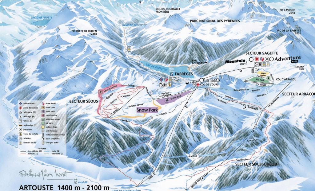Lyžařský areál střediska Artouste s výhledem na Pyrenejský národní park s nádherným panoramatem masivu Pic du Midi d’Ossau vás přivítá autentickou a rodinnou atmosférou. V letním období je tato lokalita proslulá svojí vysokohorskou železniční tratá.