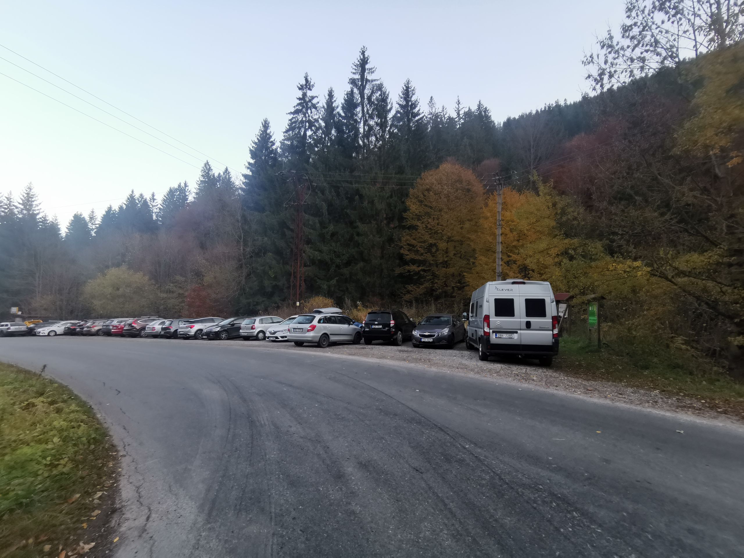 Předpověd počasí slibovala pěkný slunečný, i když větrný den. V takové dny bývají možnosti bezplatného parkování pod horou rychle vyčerpány, proto jsme na bezplatné parkoviště v Papežově přijeli pozdě večer. Místo se sice mírně svažuje, horní část je ale poměrně rovná a auto se zde dalo bez velkých obtíží, s pomocí vzduchových měchů, zaparkovat do roviny. Mimo nás zde parkovalo přes noc ještě několik osobních aut.