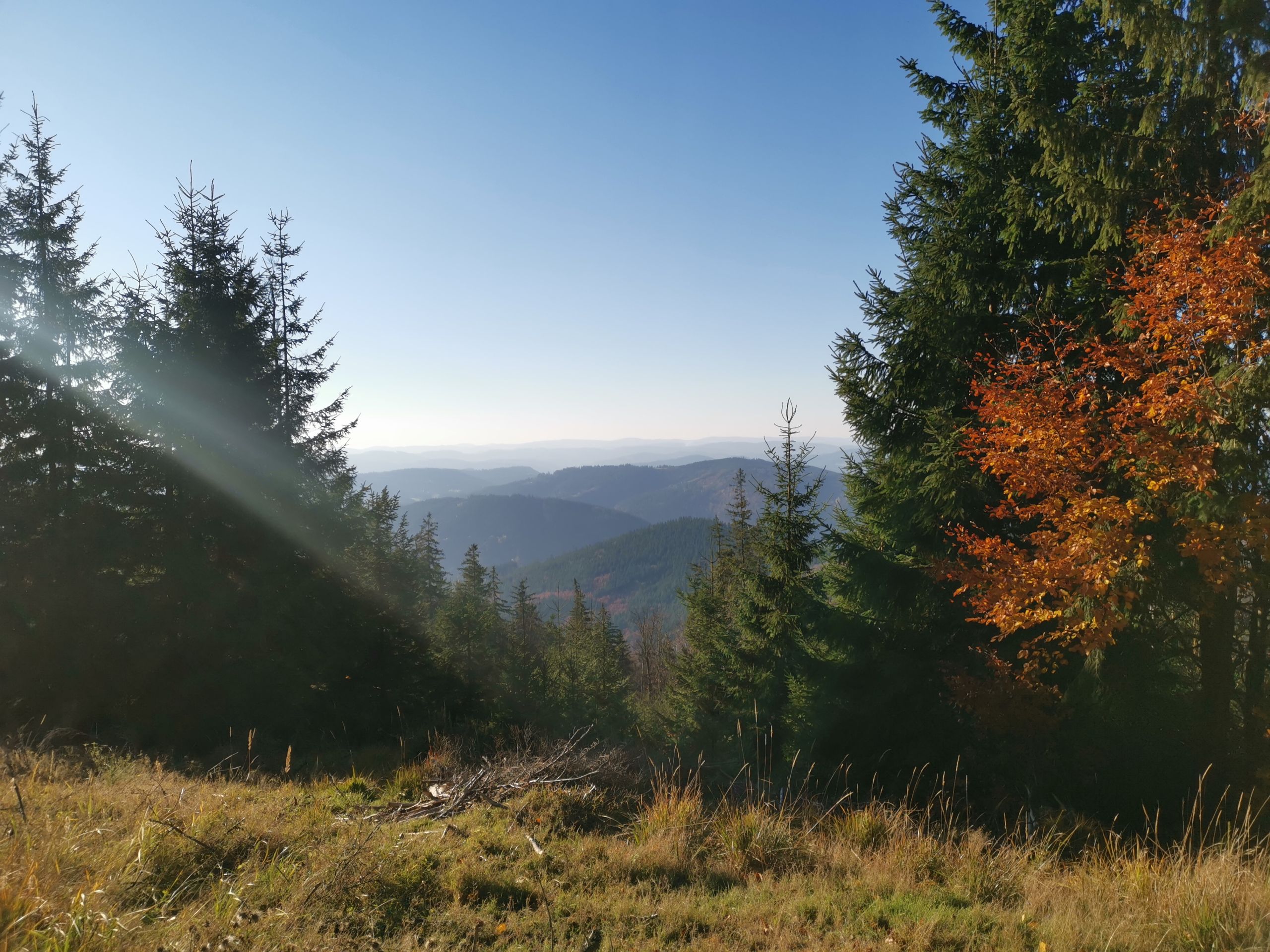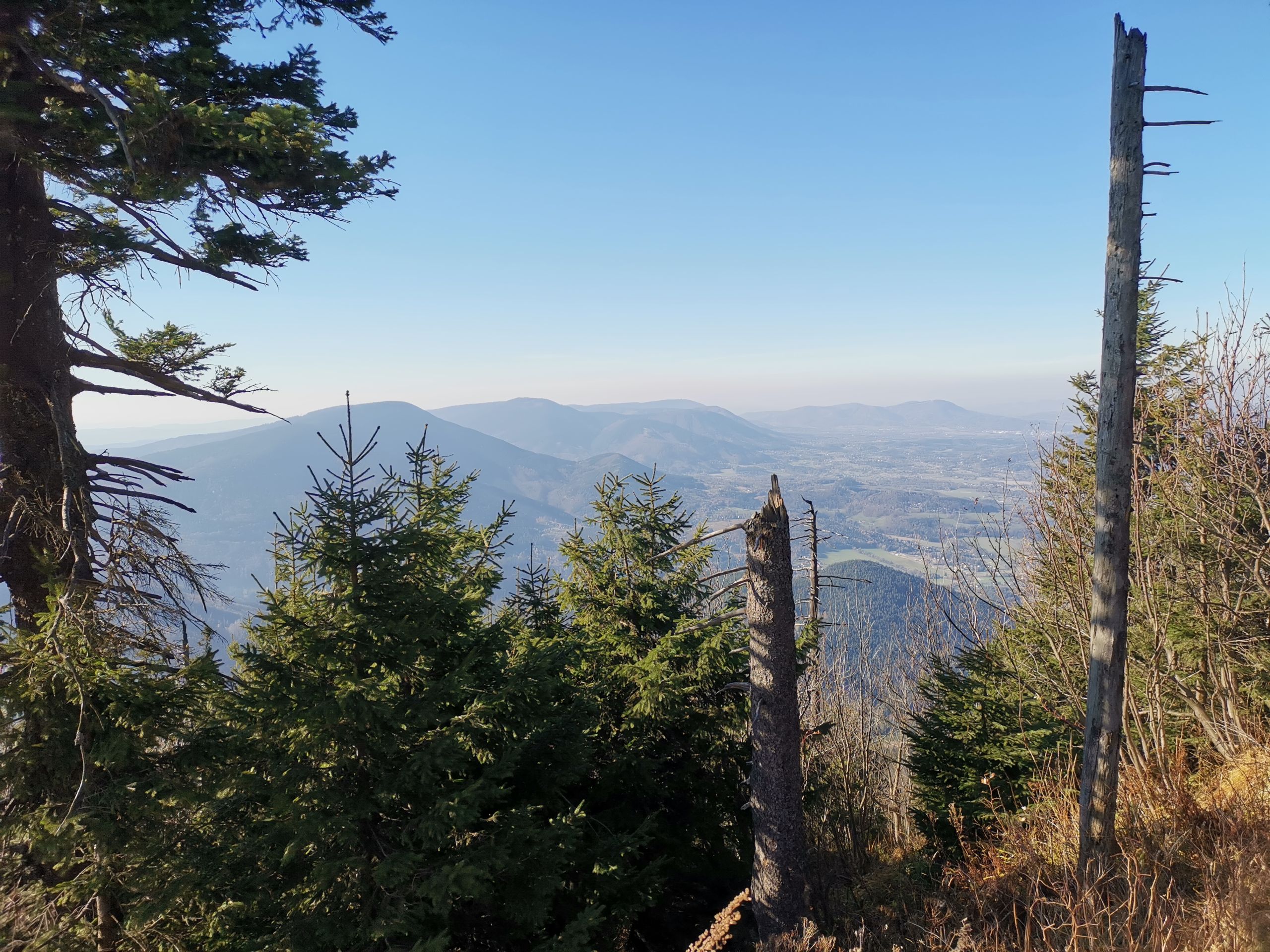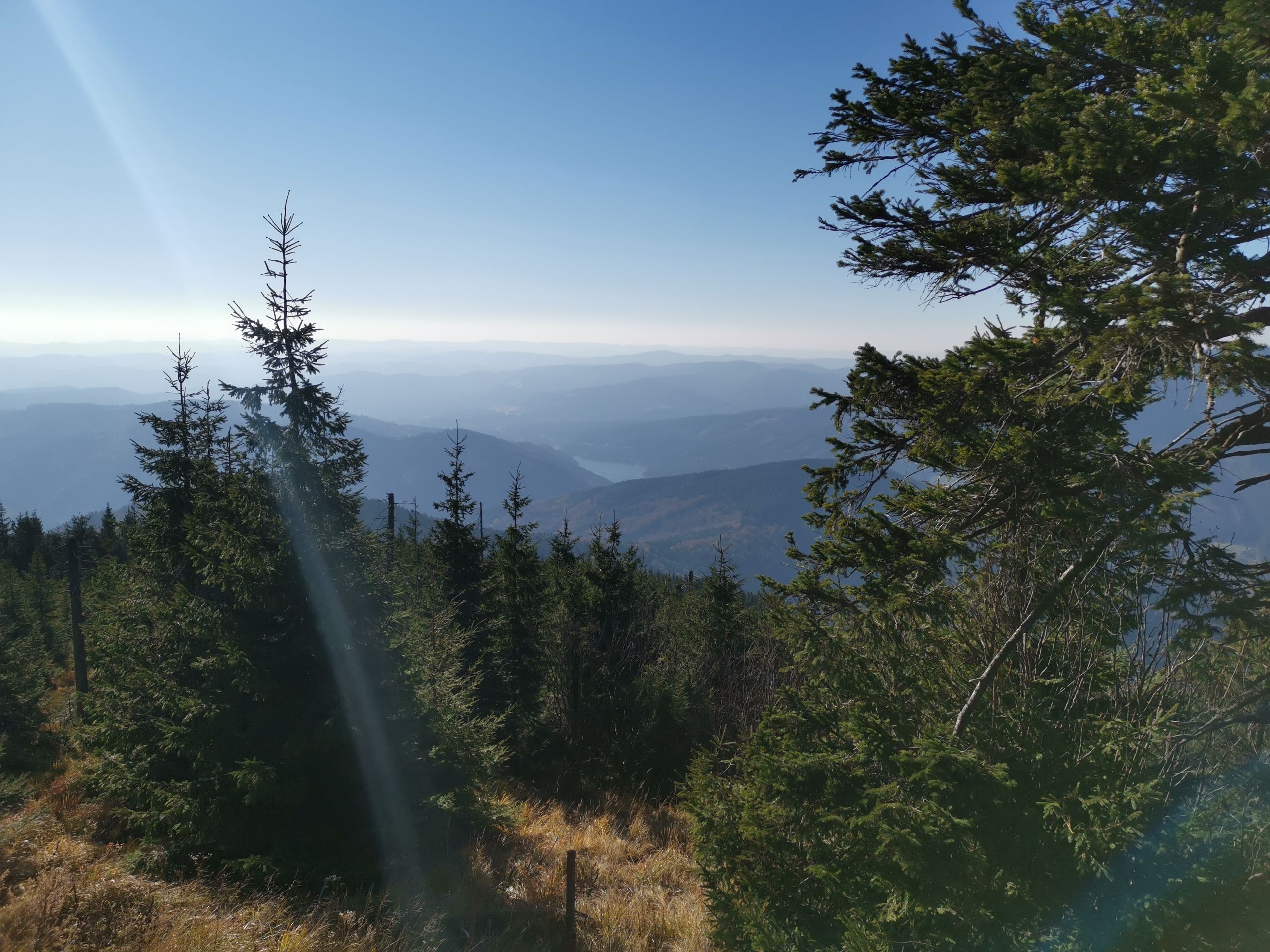 Ale společně jsme si ještě prošli celý vrchol hory – od všech chat je nádherný vyhled do okolí a byla vidět i vodní nádrž, tedy náš další cíl. Její hladina nesměle vykukovala mezi okolními kopci.