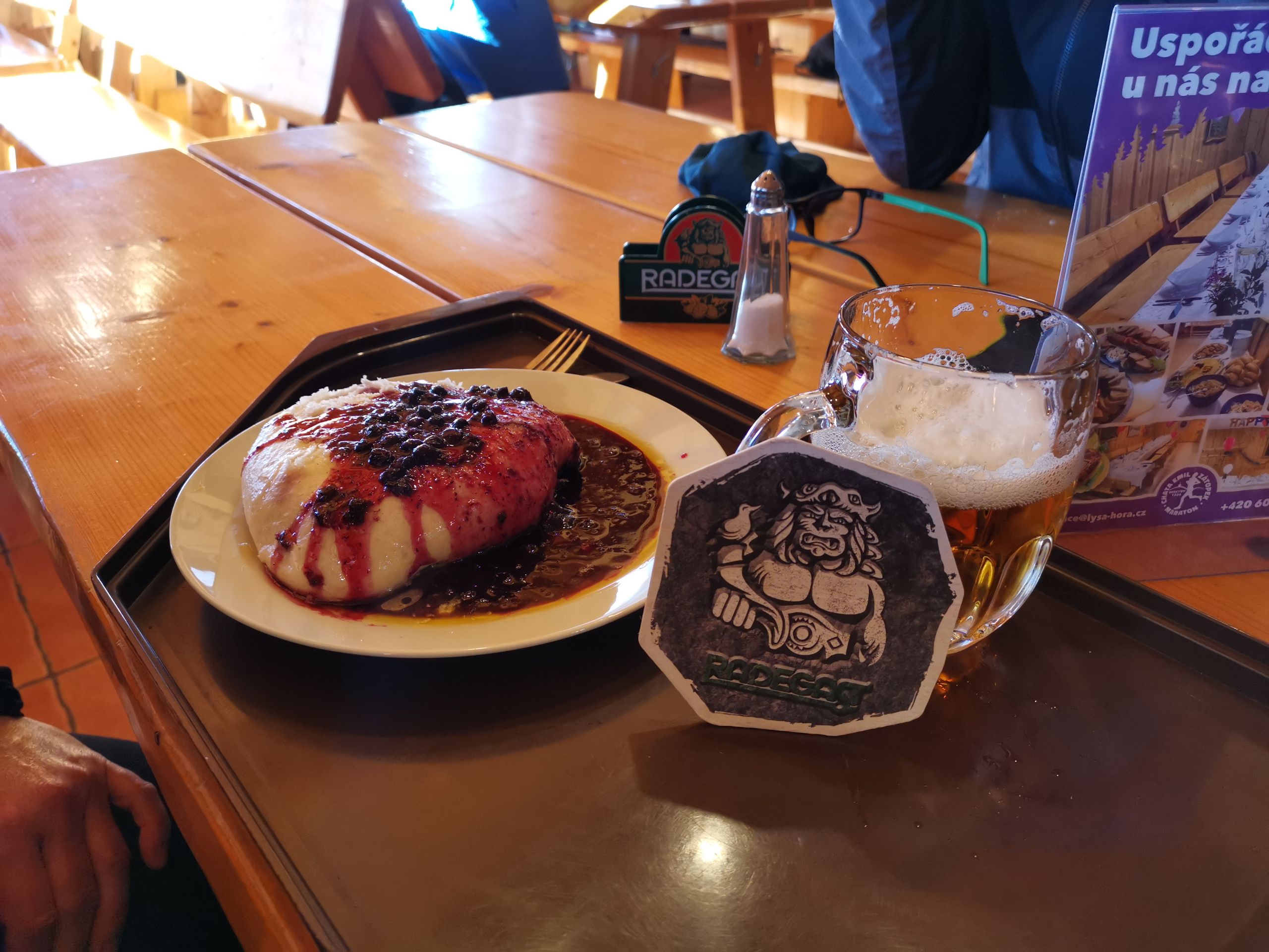Před samotným vrcholem je možné si cestu zkrátit výšlapem po sjezdovce. Zatímco až pod vrchol byla cesta v pohodě, nahoře se ukázalo, že co do slibu větru byla předpověd pravdivá a tak jsme rádi zapadli do chaty Emila Zátopka na nějaké to posílení. Borůvkový knedl a pivo přišel po výstupu vhod. V chatě se lze i ubytovat.