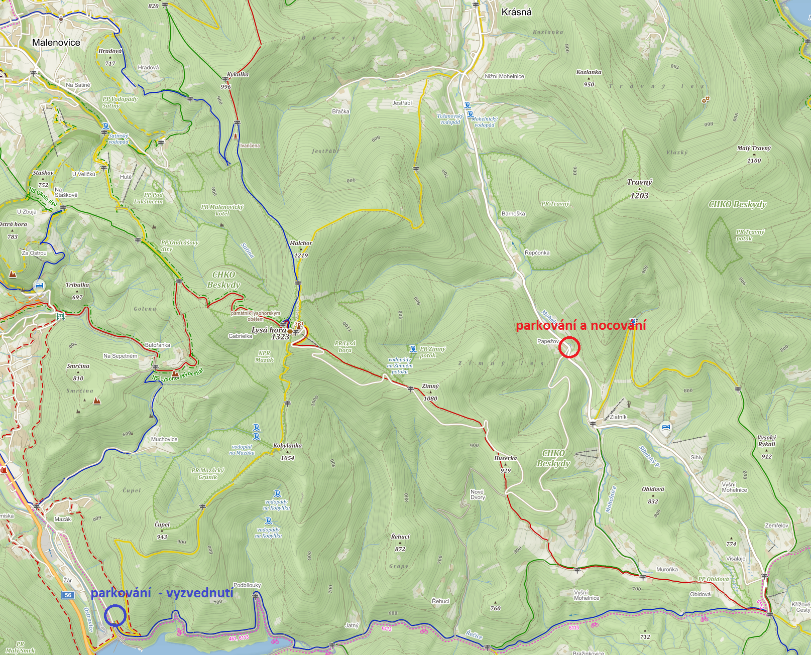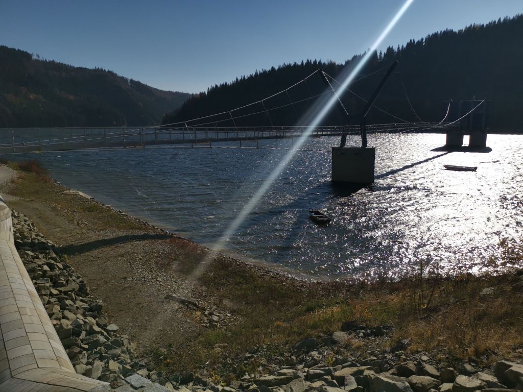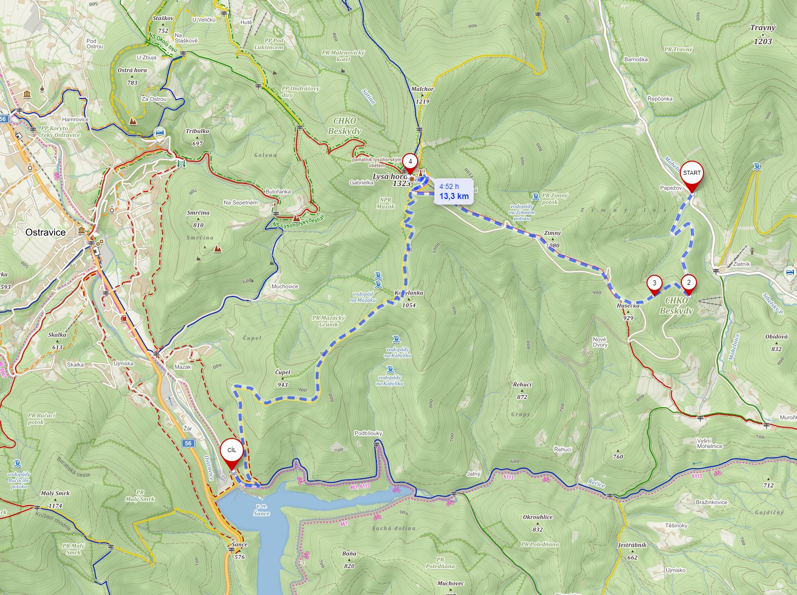 Plán se vydařil – sestup po žluté je náročnější než červená stezka na druhé straně kopce. Ovšem při sestupu dolů k autu jsem se červené moc nedržel a sestupoval jsem poměrně strmými lesními stezkami. Nakonec se mi podařilo k Šanci přijet asi o pět minut dřív než sem dorazil zbytek posádky. A měl jsem docela štěstí, uvolnilo se místo velmi blízko k začátku nádrže – protože i tady bylo aut jak se říká habaděj.