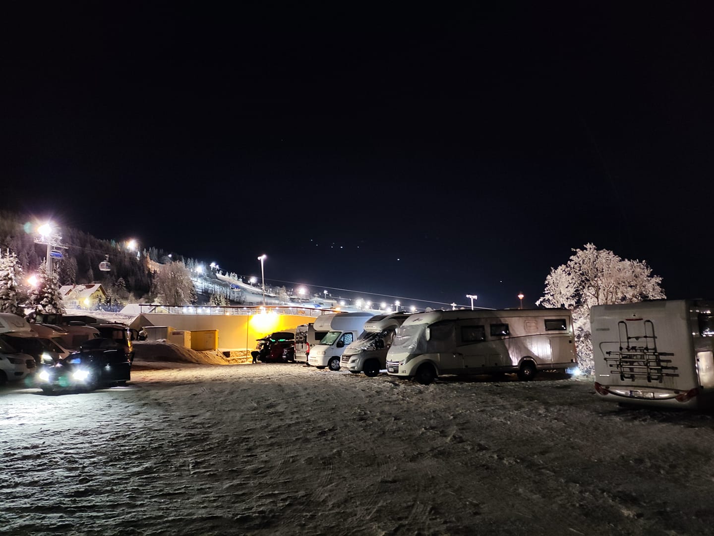 Pozor, následující řádky popisují parkovaní na ústředním parkovišti, kde nemusí být parkování obytných vozidle vžyd povoleno. V roce 2023 je pro parkování vyhrazené parkoviště P1, viz úvod článku. Uprostřed střediska je velkokapacitní parkoviště s možností stání 24h. Není zde žádná infrastruktura pro obytné vozy, pokud tedy nepočítám placené WC buňky otevřené během provozní doby a prolézačky pro děti. Ty jsou ovšem v zimě zapadané sněhem.