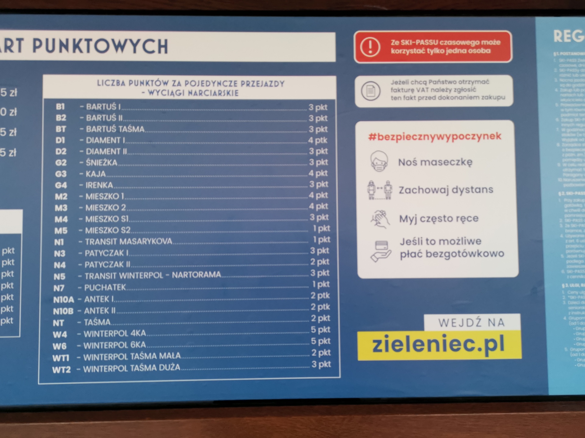 Lyžovat 12 hodin denně zde asi nevydržíte, ale lze to vhodně proložit přestávkami, zalyžovat si dopoledne, odpoledne a pak večer. Ostatně dva dny lyžování zde přijdou na méně než jednodenní lyžování ve většině středisek v Alpách a celkově i podstatně méně než u nás. Vždyť 7 hodin lyžován stojí 115 zl., večerní blok od 16:00 do zavíračky v 21:00 pak 85 zlotých a podobně. Kde se necítí, může si koupit bodové jízdné.