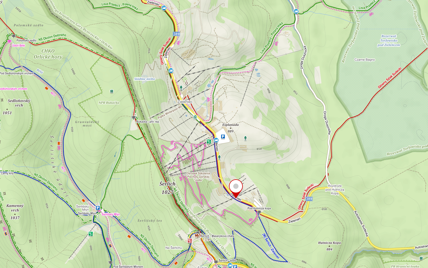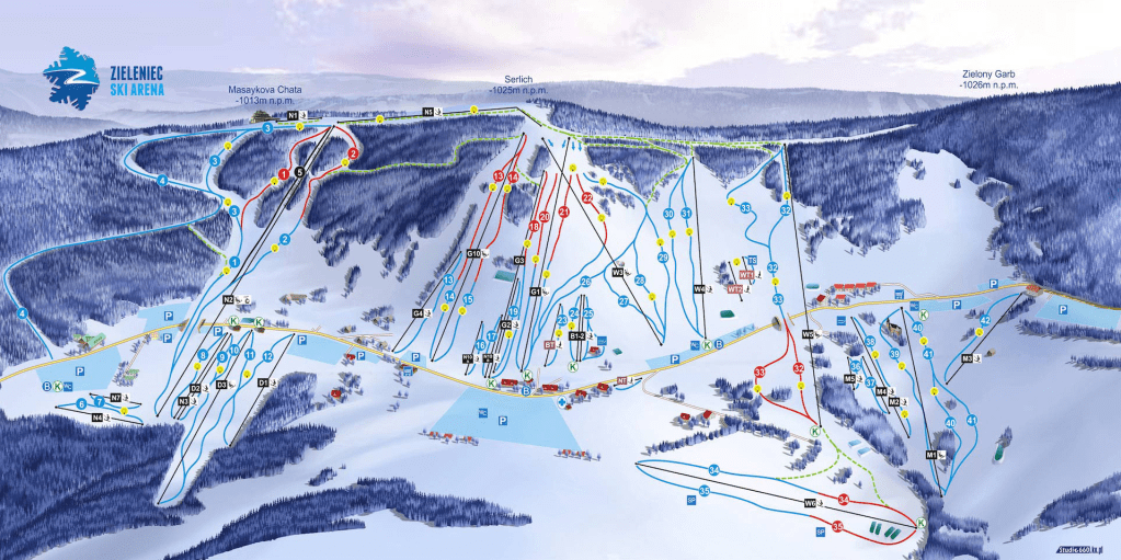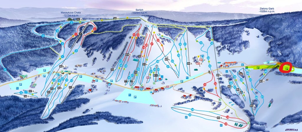 Aktualizace 2023: nově je pro obytná vozidla vyhrazeno parkoviště P1 na začátku areálu při příjezdu ve směru od Náchoda. Parkování je popsáno na samostatné stránce v polštině, překladač to bez problému správně přeloži – https://zieleniec.pl/parkowanie-w-zielencu/. Cesta do hlavní části střediska je poměrně jednoduchá, jen se musí koupit skipas ještě před sjetím na lyžích u konečné lanovky M1.