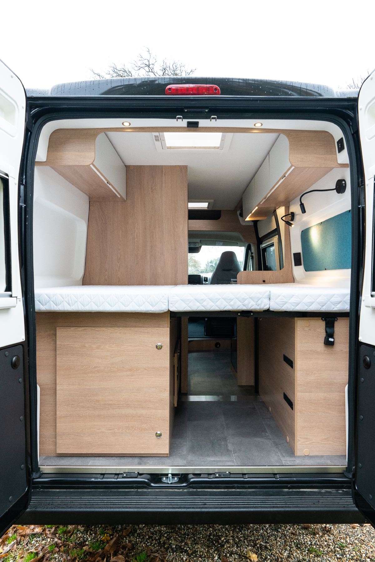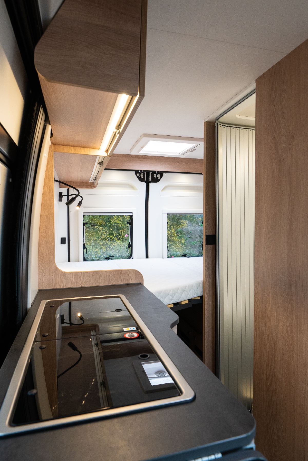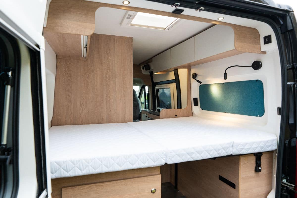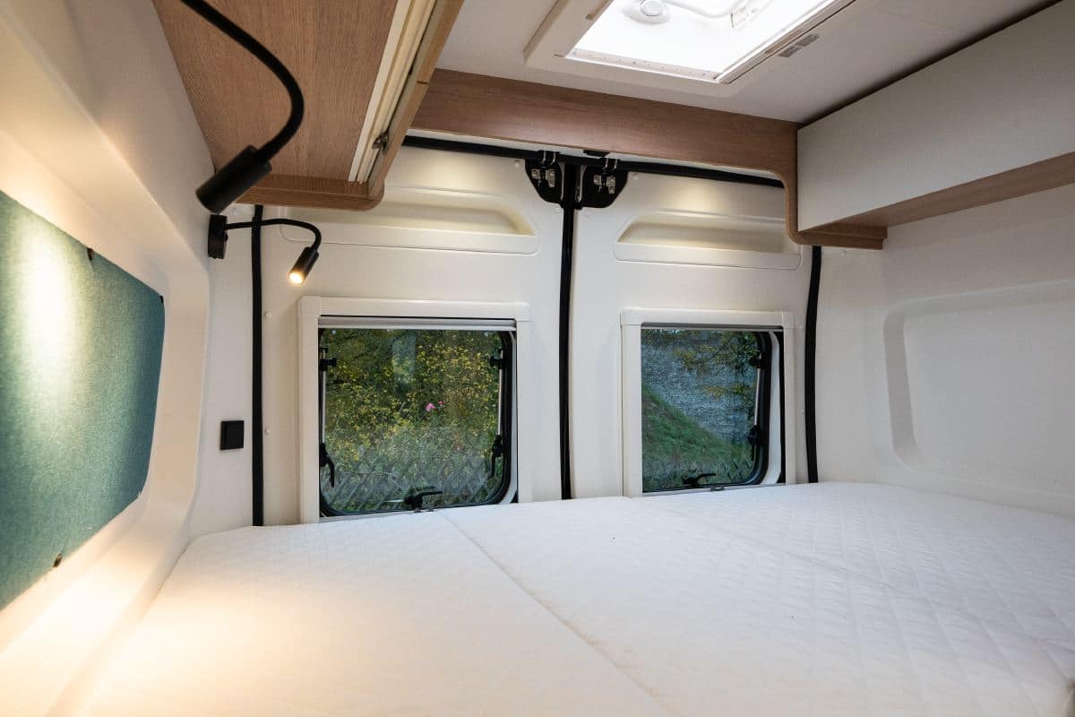 Postel pak ničím nepřekvapí, úložný prostor je ale poměrně úzký. Příjemné ale je, že skříňky začínají až kousek za zadními dveřmi, je zde tedy napříč dostatek prostoru pro přepravu například lyží. Postel není na koncích stejně široká, na straně koupelny je užší, má zde necelých 120 cm, u kuchyňského bloku je pak šířka 135 cm. Zde jsou i dvě flexibilní lampičky s USB porty.