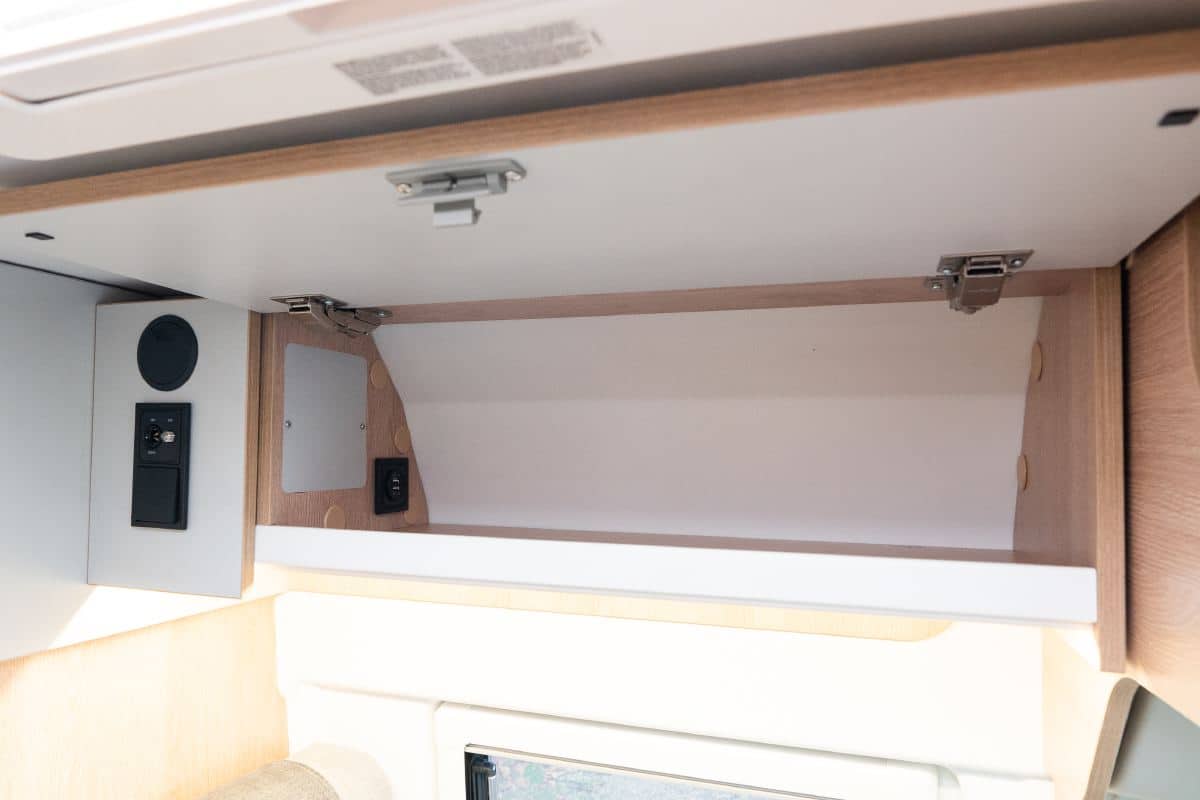 Snad jediné, co trochu kazí dojem, je zatemnění předních oken závěsem – zde by se více hodily rolety. Skříňka nad sezením nabízí prostor pro instalaci techniky – například wifi/GMS routeru – to lze zase hodnotit kladně.