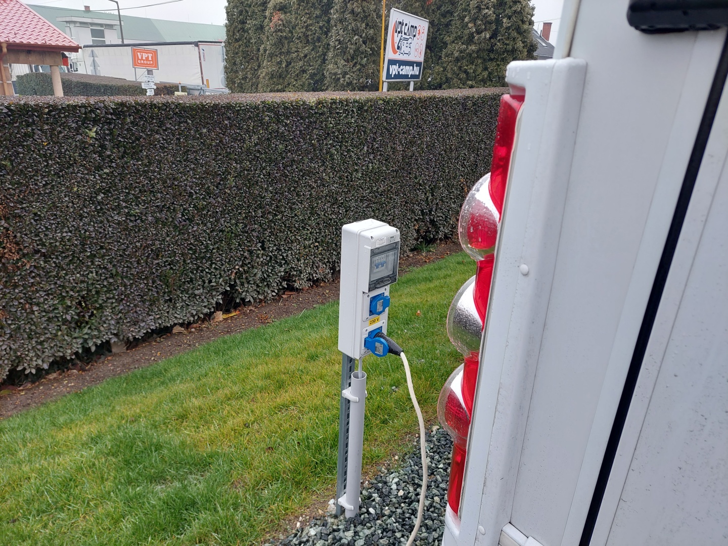 Parkoviště bylo příjemně osvětlené, takže i když jsme přijeli v noci za deště, mohli jsme se perfektně zorientovat. Na štěrkovém parkovišti bylo 6 míst označených pomocí květináčů s rostlinami. Náš 7,4 m dlouhý obytný vůz se do něj vešel tak akorát, ale moc místa už nezbývalo. Každé parkovací místo má sloupek s elektřinou, nenajdete zde ale CEE zásuvku, ale jen standardní domácí zásuvkou. V ceně parkovného je elektřina již zahrnuta.