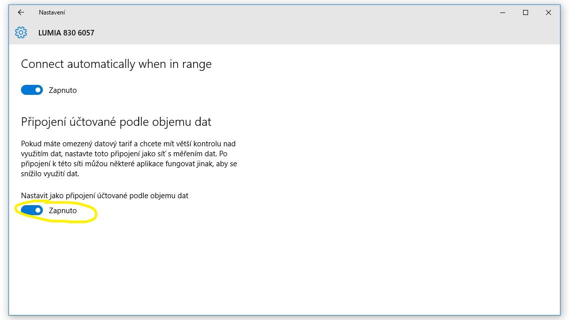 Wi-Fi připojení na bezdrátovou síť v obytném autě je nutno nastavit jako metered/účtované. Velmi pěkně je to vysvětleno v článku Jak na Windows 10 nastavit připojení účtované podle objemu dat, aneb šetřete FUP na cestách a to včetně obrázků. Toto nastavení je samozřejmě nutné provést na všech Windows zařízeních, které se na síť připojují.