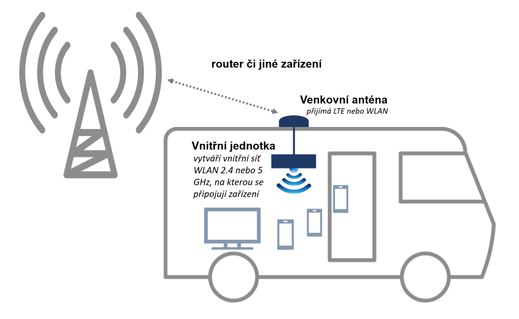Na palubě tuto síť vytvoří tzv. vnitřní jednotka, neboli router. Ten pak tuto vnitřní síť WLAN na 2.4 nebo 5 GHz propojí s Internetem a to buď přes datové spojení operátora (LTE) a nebo dostupnou veřejnou síť WLAN (například z restaurace McDonalds). Zmíněná vnitřní jednotka může mít hned několik podob. V tomto článku budou jednotlivé možnosti postupně podrobněji popsány. Vnitřní jednotka se může se obejít i bez venkovní antény Pro stabilnější příjem je ale vhodné, aby zde vnější anténou byla . Vhodné typy antén budou v článku také popsány.