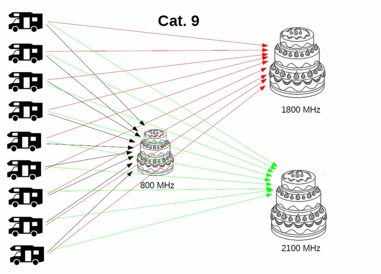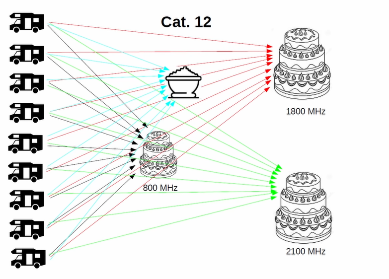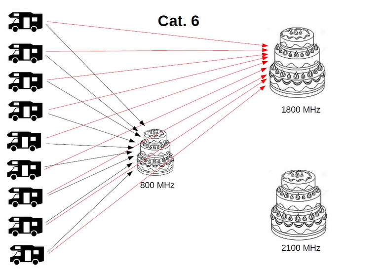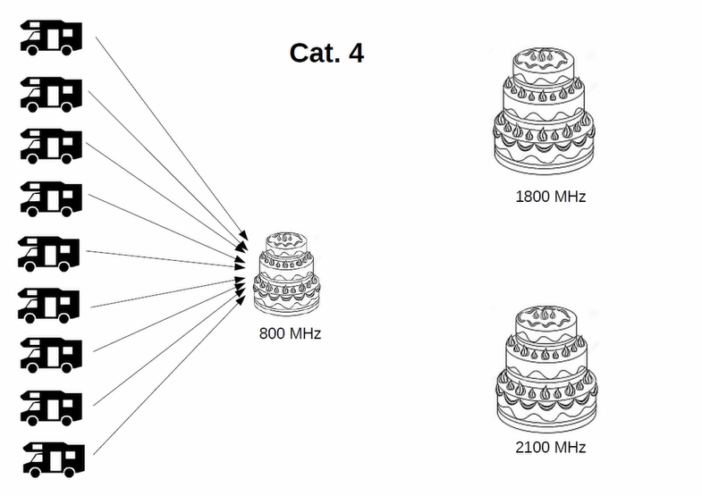 Značná část zařízení nabízených pro připojení a sdílení k internetu v obytných vozech je jen kategorie 4 (CAT4) – což je v roce 2022 na pováženou. Tato zařízení umí komunikovat jen v jednom vybraném pásmu (například 800 MHz, jak je uvedeno na obrázcích níže). Zařízení vyšších kategorií dokáži přenos rozdělit a dále různě kombinovat a tak dosahovat vyšších přenosových rychlostí. Tyto rychlosti jsou čistě teoretické, v praxi běžně dosahovány nejsou, nicméně schopnosti ilustrují pěkně.