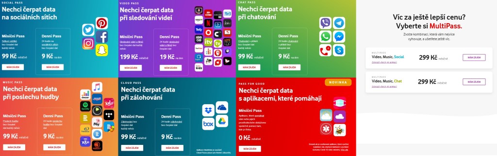 Vodafone je datově v rámci EU poměrně štědrý a navíc má i jednu specialitku, tzv. Vodafone Pass. Používání aplikací zahrnutých do těchto pasů, nemá vliv na počítání dat a to ani v rámci ČR, ani v zemích zóny 1 (EU + Norsko, Lichtenštejnsko a Island) za předpokladu, že nemáte vyčerpaná data (nemáte vyčerpaný DataLimit nebo DataStrop) A opět jako u dvojSimky, nelze tuto nabídku aktivovat pro tzv. neomezené tarify. Za 0 či od 99 do 299 Kč měsíčně si lze zvolit vhodný Pass či MultiPass:
