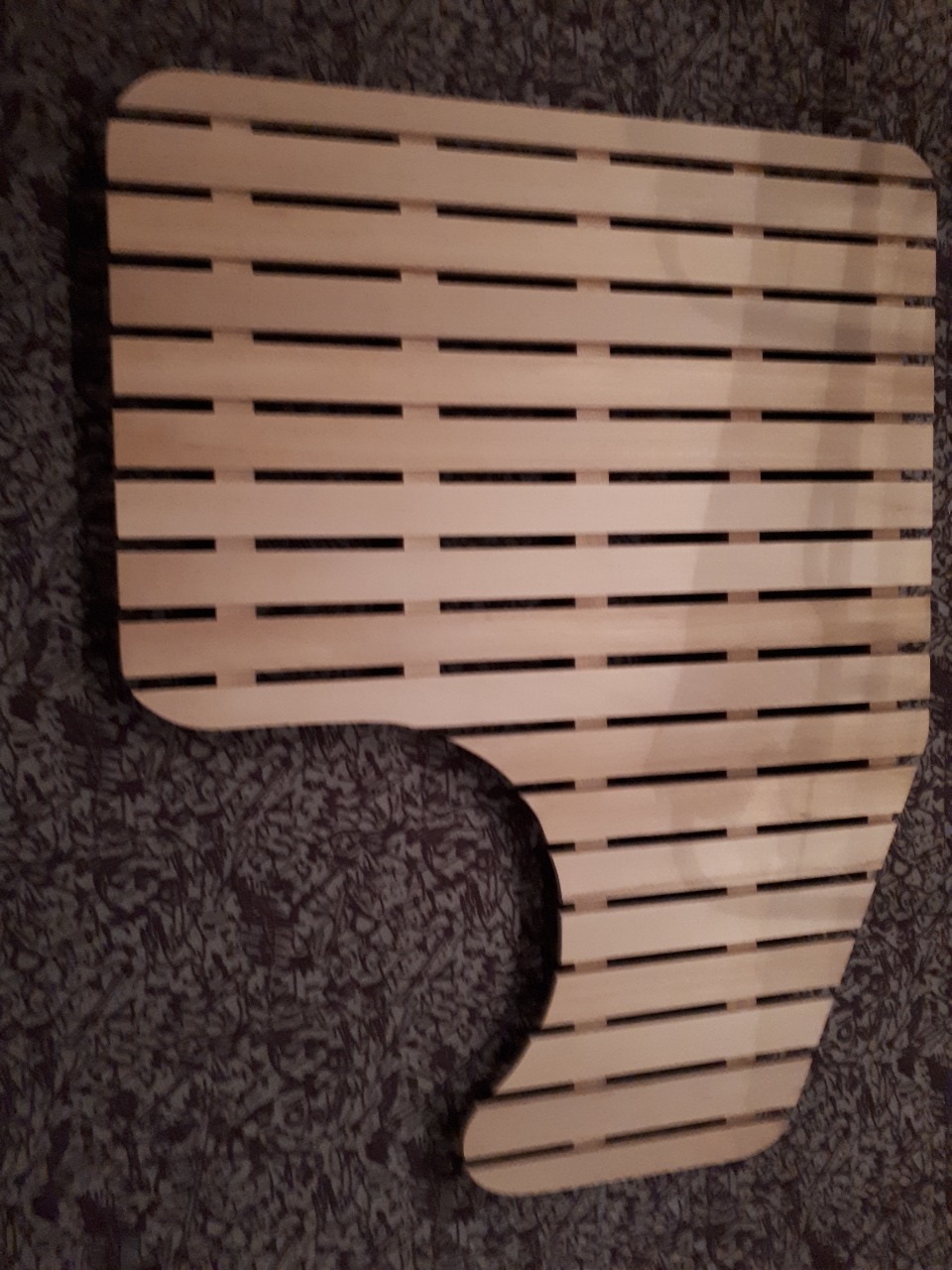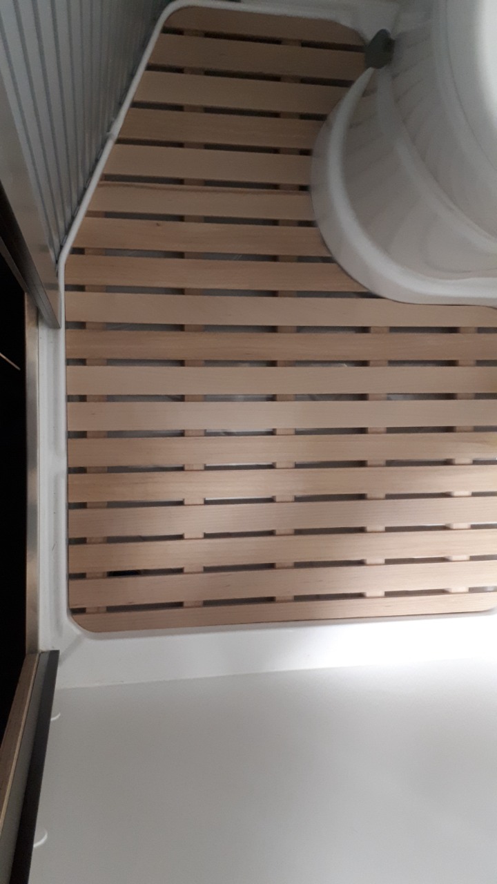 Opět od uživatele Schuetzbach: řešil něco do sprchové vaničky, jednak aby ochránil její povrch při běžném provozu, jednak aby trochu zvýšil podlahu, která je při použití WC přeci jen příliš nízká. Použil buková prkénka o rozměru 10 x 40 mm, a ty připevnil na hranoly 3 0mm z téhož materiálu, sešroubované dohromady pomocí nerezových šroubů 35 x 3.5mm. Přesný tvar si odměřil pomocí papírové šablony. Konstrukce je napuštěna voskem, Contura’s Castel Oak Grey. Ten sladil barvu dřeva s tím, které pro vestavby používá společnost Clever. Spodní část je ještě chráněna gumovým pásem, aby dřevo nebylo v přímém styku s plastem vaničky