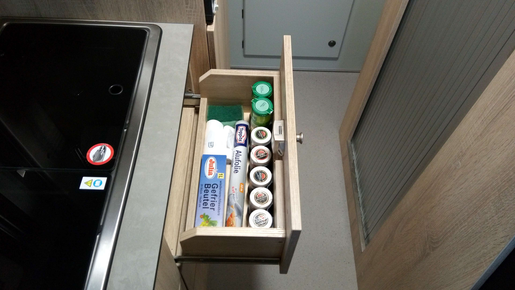 Od uživatele Mischu: V kuchyňském bloku bývá pod dřezem hluché místo, pouze zakryté pevnou deskou. Přitom je zde prostor pro ne příliš hluboký šuplík, který lze využít například pro uložení kořenek.