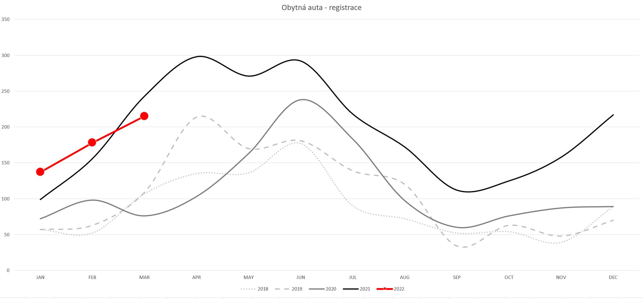 Ano, celých 18 měsíců rostl meziročně počet registrovaných nových obytných aut, až březen 2022 toto období ukončil a přinesl meziroční propad o 12%. Celkem se v březnu zaregistrovalo 215 aut, kdežto o rok dříve 243. Jakkoli se to může zdát jako pokles, je nutné si vzpomenout, že před rokem 2020 byly běžný počet registrací jen poloviční, to jest kolem stovky vozidel.
