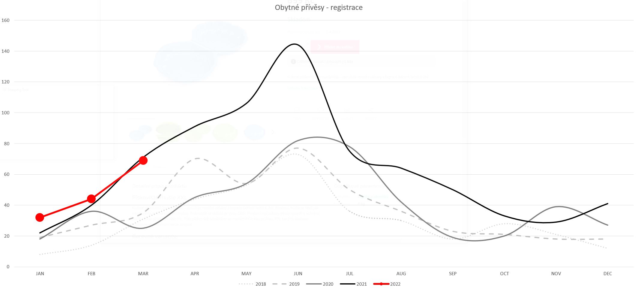 Zde je procentuální pohled přeci jen radostnější. Nových obytných aut se za leden až březen 2022 registrovalo 530 aut, což je ve srovnání s 498 vozidly za první čtvrtletí minulého roku stále slušný nárůst o 6%. U přívěsů znamená 145 vozidel dokonce nárůst o 9%, minulý rok přibylo do našeho registru vozidel jen 133 kusů.