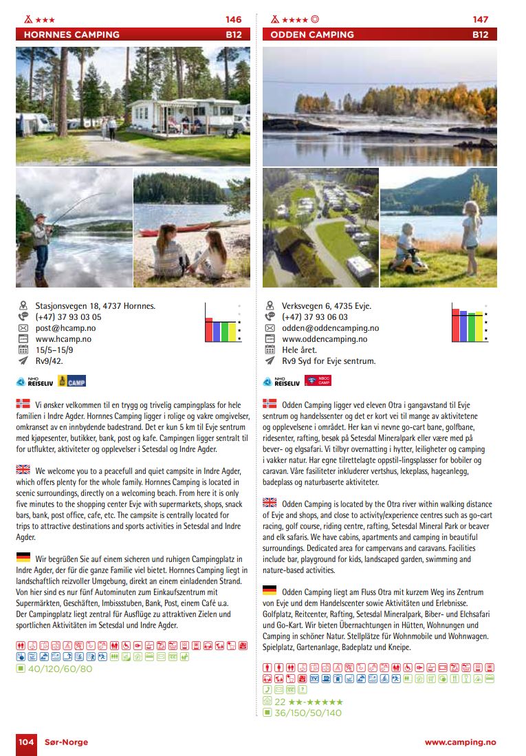 Aktuální seznam norských kempů pro rok 2022 si můžete stáhnout ze stránek https://camping.no/ ve formátu pdf: zde (29MB). Tohoto průvodce si lze objednat za 115 norských korun v tištěné podobě.