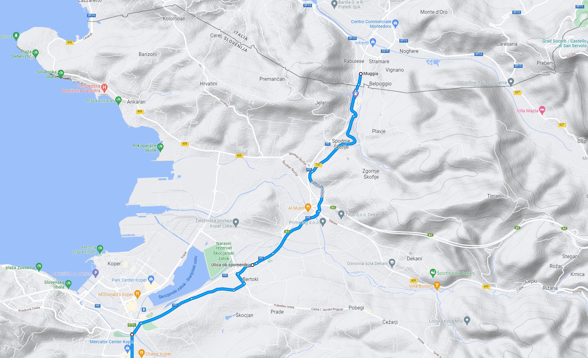V Itálii zůstaňte na dálnici směr Koper, NSA326. Při překročení hranice Itálie – Slovinsko u Rabuiese si lze všimnout značky konec dálnice (italské), slovinská H5 začíná u čerpací stanice OMV. Je dobré z dálnice tedy hned odbočit doprava, k obchodu Kompass. Odtud lze najet na silnici Skofje/Bertoki, která vede za čerpací stanicí.