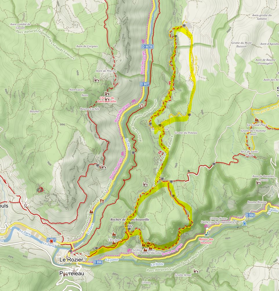 Ideálním výchozím místem je vesnice Le Rozier. Je zde hned několik kempů a ceny více než příznivé. Dva dospělí s obytným vozem zde nechají nechají v hlavní sezóně necelých €25, rodina 2+2 se vejde pod €40. Mimo sezónu jsou ceny ještě příjemnější, €17.4 a €26.40
