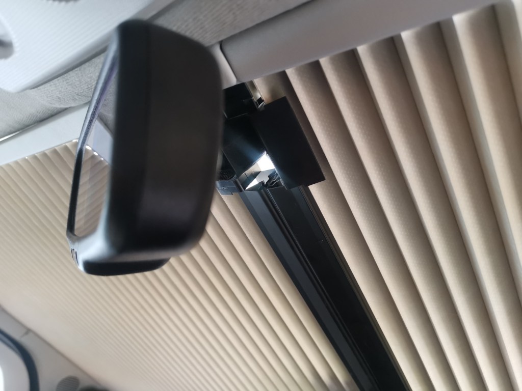 Zrcátko nemá konzoly pro patku, která se používá ve vozech Ducato, ale to jsem řešil koupí konzole přímo pro Ducato, rozebráním a sestavením dílu přímo pro patku. Mezikus je vytištěn na 3D tiskárně a navíc jsou oba kovové díly spojené ještě matkou, takže odpadnutí se netřeba se bát. Na pohled není poznat neoriginální spojení. Konzole s kabelem nijak nepřekáží zatemňovacím roletám, ostatně ty již měly od výrobce vykrojení právě pro něj. Výhodou vybraného zrcátka jsou rozměry, 23 na 8 cm.