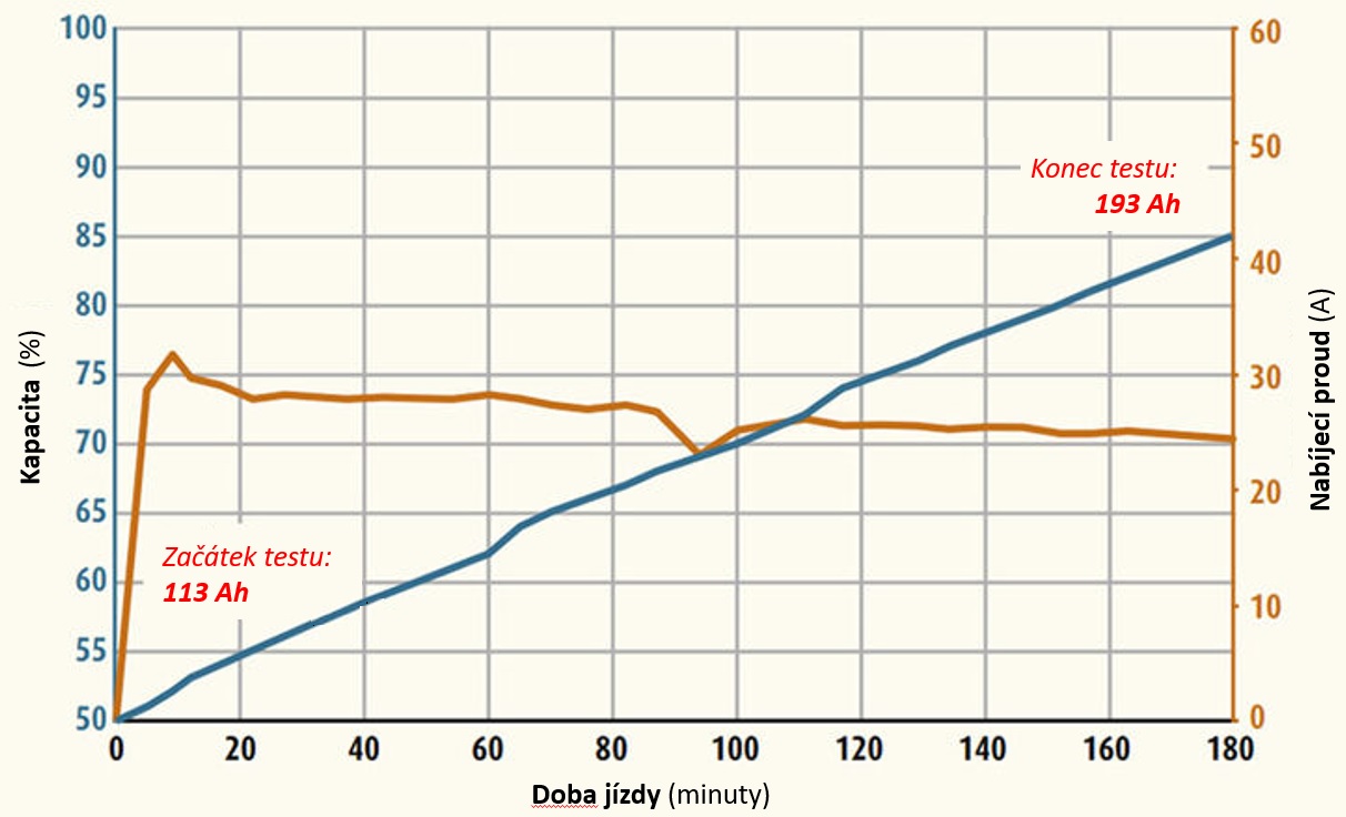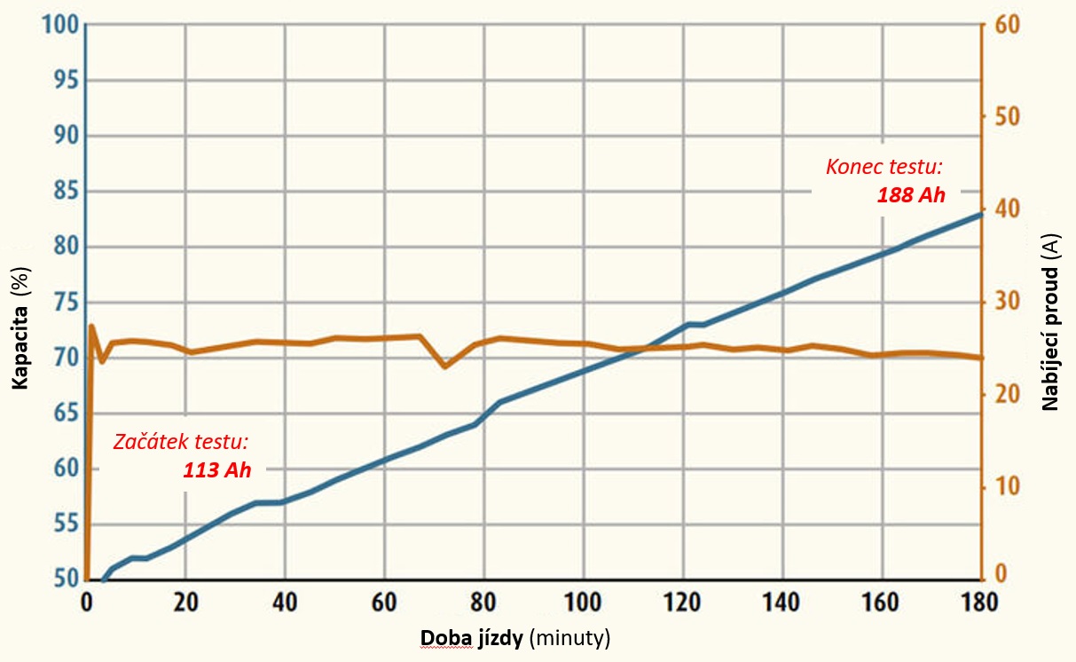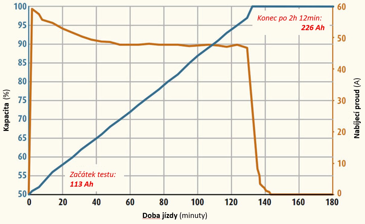 - k plnému dobití akumulátoru došlo do 2 hodin a 12 minutách jízdy – tedy doplněno 113 A, na konci jízdy plná kapacita 226 Ah