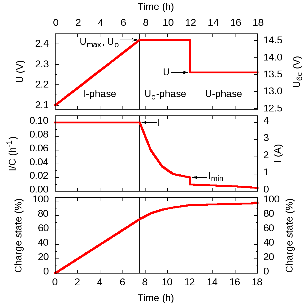 Fáze 2 — konstantním napětí Uo, neboli absorpční stupeň– V této fázi se akumulátor dále nabíjí při konstantním (pře)napětí U o , ale nabíjecí proud klesá. Napětí v U o fázi je příliš vysoké na to, aby mohlo být aplikováno neomezeně dlouho, ale umožňuje plně nabít akumulátor v relativně krátkém čase. Tato fáze je ukončena, když nabíjecí proud klesne pod prahovou hodnotu I min , obvykle je akumulátor nabit na přibližně 95 % své kapacity.
