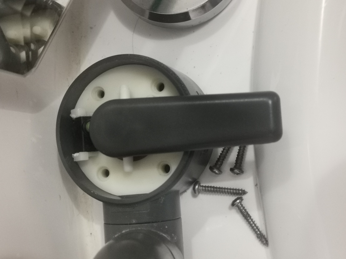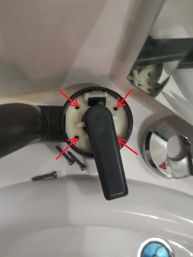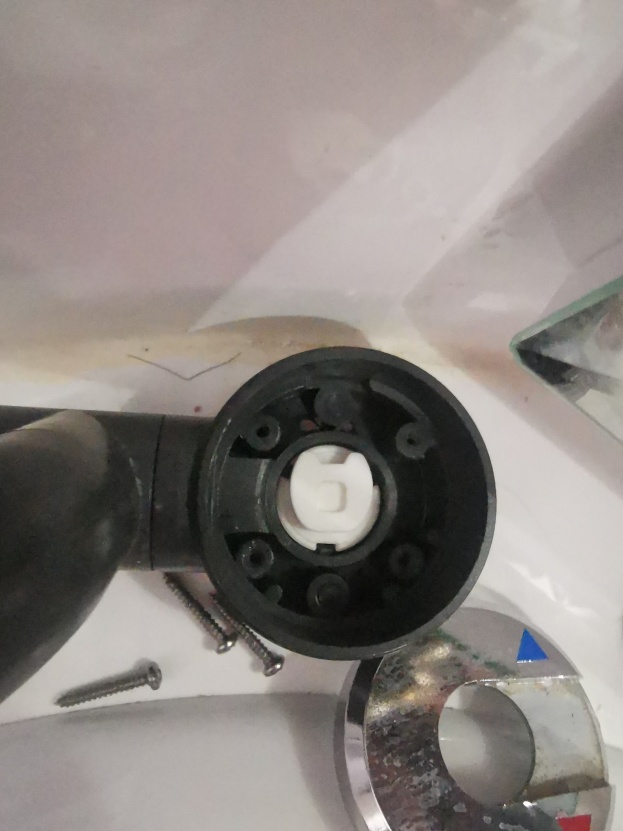 Poté stačí na vodovodní baterii oddělat vrchní naklapnutý kryt, povolit čtyři šroubky a celý horn9 ovládací mechanismus lze vytáhnout. Na obrázcích si lze všimnout, že mám horní kryt u značky teplé vody povrchov2 poškozen. To nevzniklo při tomto zásahu, tenhle kryt byl původně na baterii u dřezu a nějak se tam poškodil. Vyměnil jsem je tedy, v koupelně to není tak vidět :-).