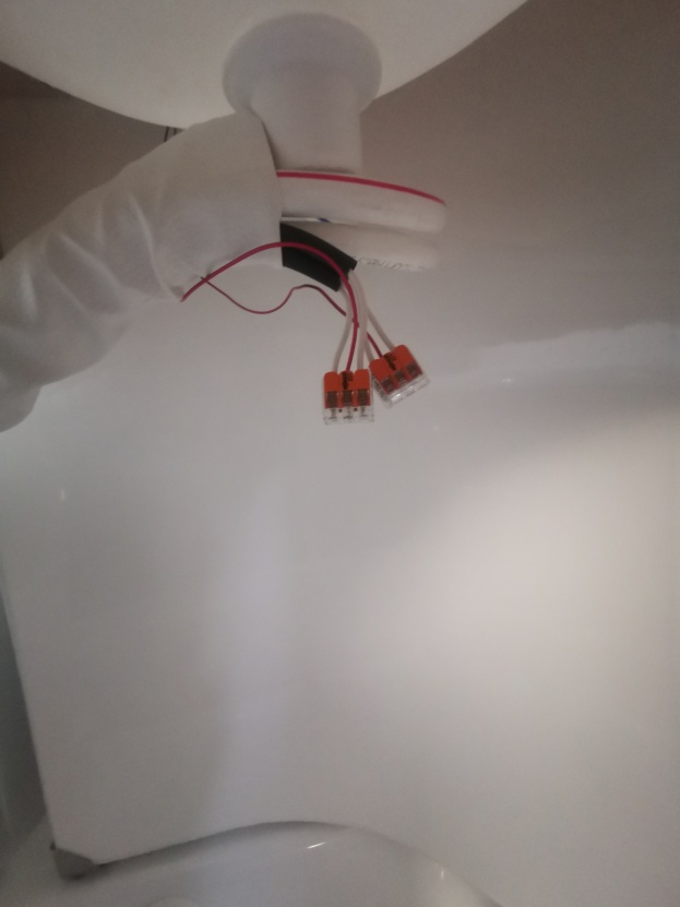 Pak se mikrospínač zpátky vrátí do plastové objímky z baterie, ta se vrátí do těla baterie, vodiče se protáhnou otvory dolů a zase se to vše sešroubuje. Pod baterii se propojí vše na stávající vodiče, přes zmíněné Wago svorky. Vyzkouší se funkčnost, zda čerpadlo sepne a zda je těleso baterie správně sešroubováno – pokud ne, začne tam protékat viditelně voda. A pokud je vše v pořádku, nasadí ze zpátky kryt a je hotovo.