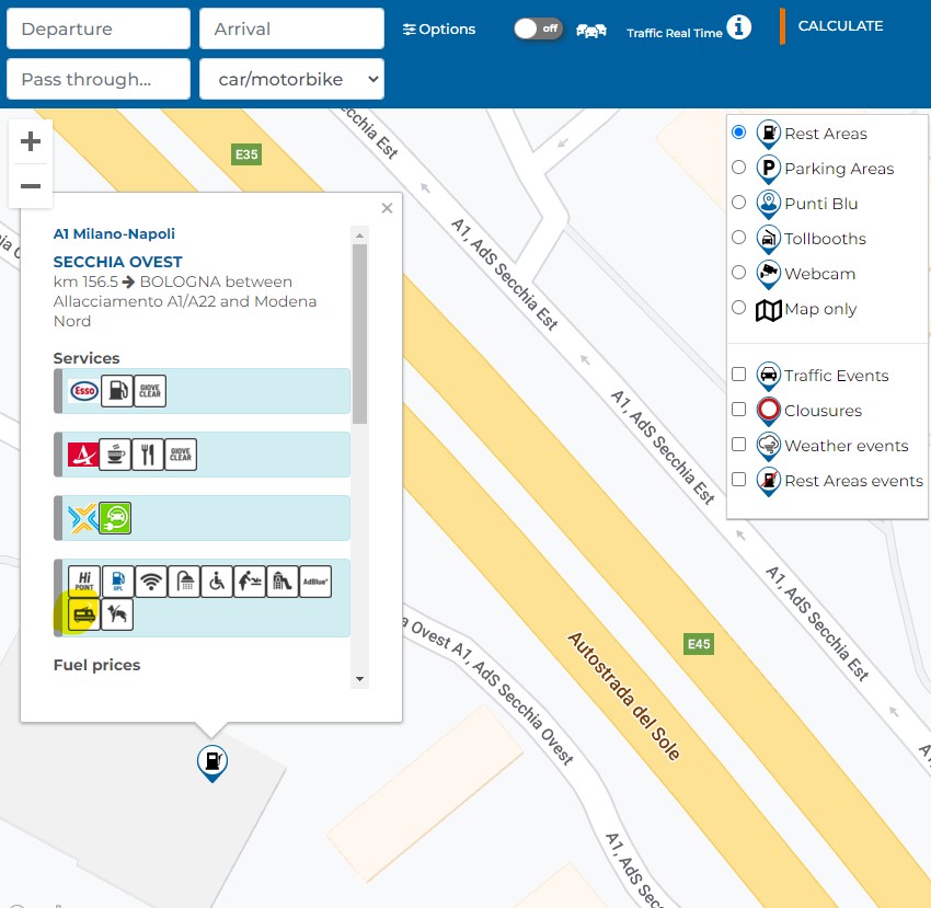 Mapka italských dálnic dokáže zobrazovat například jen odpočívky, stačí zaškrtnou volbu Rest Areas (s čerpacími stanicemi) nebo Parking Areas (jen parkování). U každého zobrazeného místa se zobrazí aktuální informace, v případě čerpacích stanic i ceny pohonných hmot, navíc se objeví i informace, jestli je na daném místě počítáno i s obytnými vozy. Obvykle zde pak bývá možnost provedení servisu obytného vozu, někdy je k dispozici i stání s přípojkami na 230V. To vše v ceně dálnice.