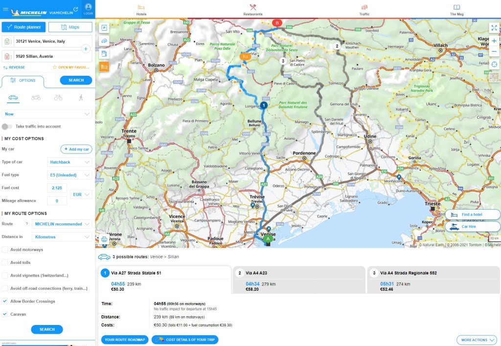 Michelin nabízí pěkné mapy, které umí kalkulovat i náklady na cestu včetně vinět a mýtného. Navíc nabízí několik tras a parametry lze různě měnit. Vypočet nákladů je vcelku přesný. Snad jedinou zásadní nevýhodou je, že umí jen obyčejné auto a nebo soupravu, tedy neumí zohlednit obytné auto. To zrovna v Itálii nevadí, ta kategorie Class B je cenově prakticky totožná s osobním autem, stačí přihodit pár deseticentů k ceně (cca 2.5%). V jiných zemích je to horší, ve Francii je potřeba násobit koeficientem, jak je uvedeno i v přehledech mýtného a dalších poplatků zde.