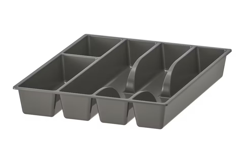 Příborník SMÄCKER (2020: 19 Kč, 2022: 29 Kč) – vejde se do většiny vestaveb, pravda, já měl dodán příborník od výrobce, ale pokud se vám stávající poláme či vás omrzí jeho barva, lze si tento tmavě šedý koupit jako náhradu.