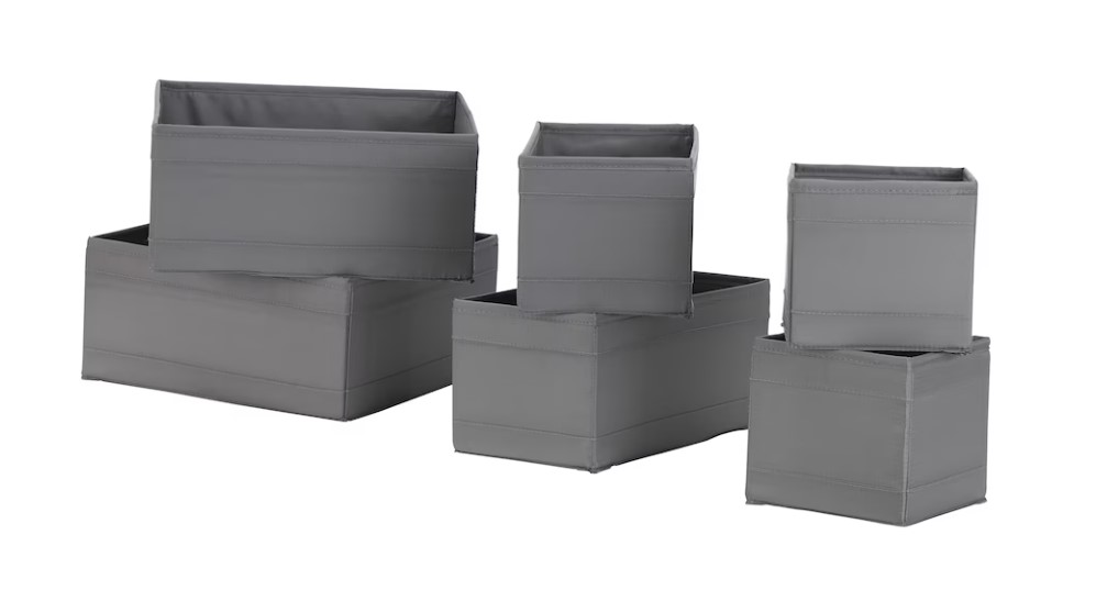 Pro organizaci ve skříňkách se hodí sada 6 krabic SKUBB za 169 Kč (2022), někteří si oblíbili i poličku na kořenky BEKVÄM za 99 Kč (2022)