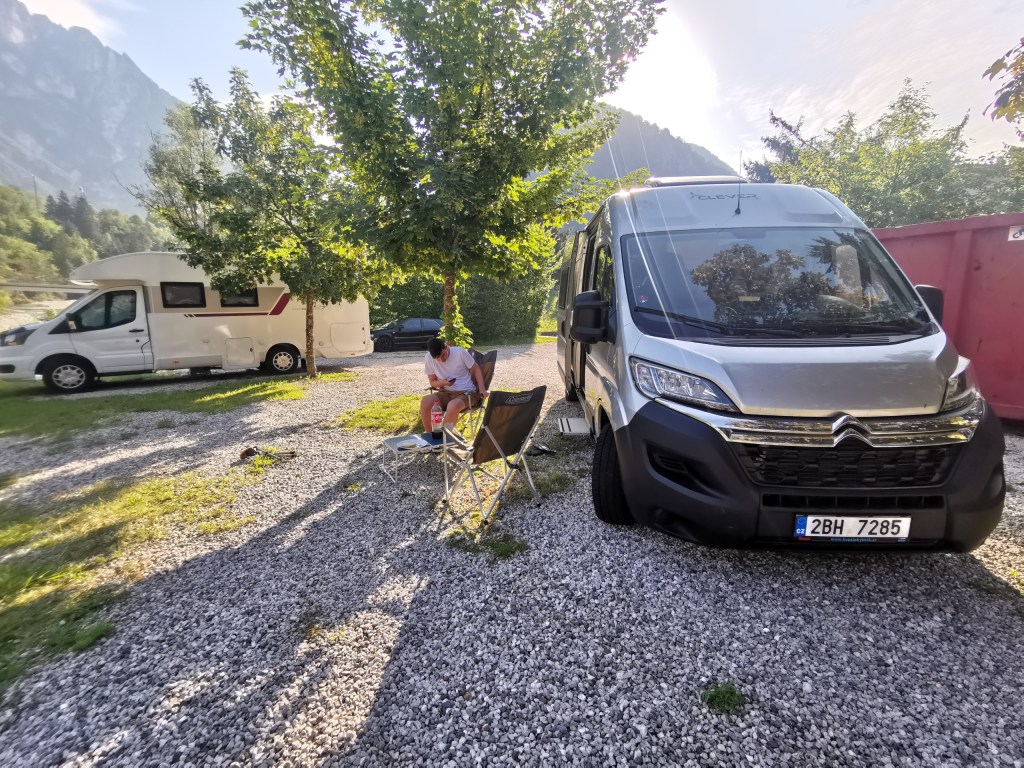 Cesta probíhala s ohledem na naší malou cestovatelku, ale ne moc odlišně od našich jiných cest tímto směrem. Po večeři jsme někdy po sedmé večer vyrazili směr Rakousko. Plán byl, že vnučka po večeři jako obvykle usne, což se i stalo. Dalším příjemným bonusem pozdějšího výjezdu je pohodlný průjezd Vídní – při cestě z Brna po dálnici A5 na A2 se jí nelze vyhnout. Tam se obvykle člověk zdrží, pokud přijede v nevhodnou dobu. Ale to se nám nestalo, takže průjezd byl hladký a plynulý. Cesta probíhala bez komplikací, více omezení provozu na dálnici bylo v Korutanech. Po přejezdu hranic jsme v Tarvisiu sjeli na silnici číslo SS13 a pokračovali dále, v Resiuttě jsme měl vyhlédnuté místo na přenocování. A tam jsem skutečně také po jedné hodině v noci dorazili. Nebyli jsme zde rozhodně sami, místo je na P4N a tak tady byli tři další obytné vozy, ale místa je tady dost i pro více obytných aut. Je asi jen otázkou času, jak dlouho toto místu bude přístupné, i když místní snad nejsou příliš obtěžováni.