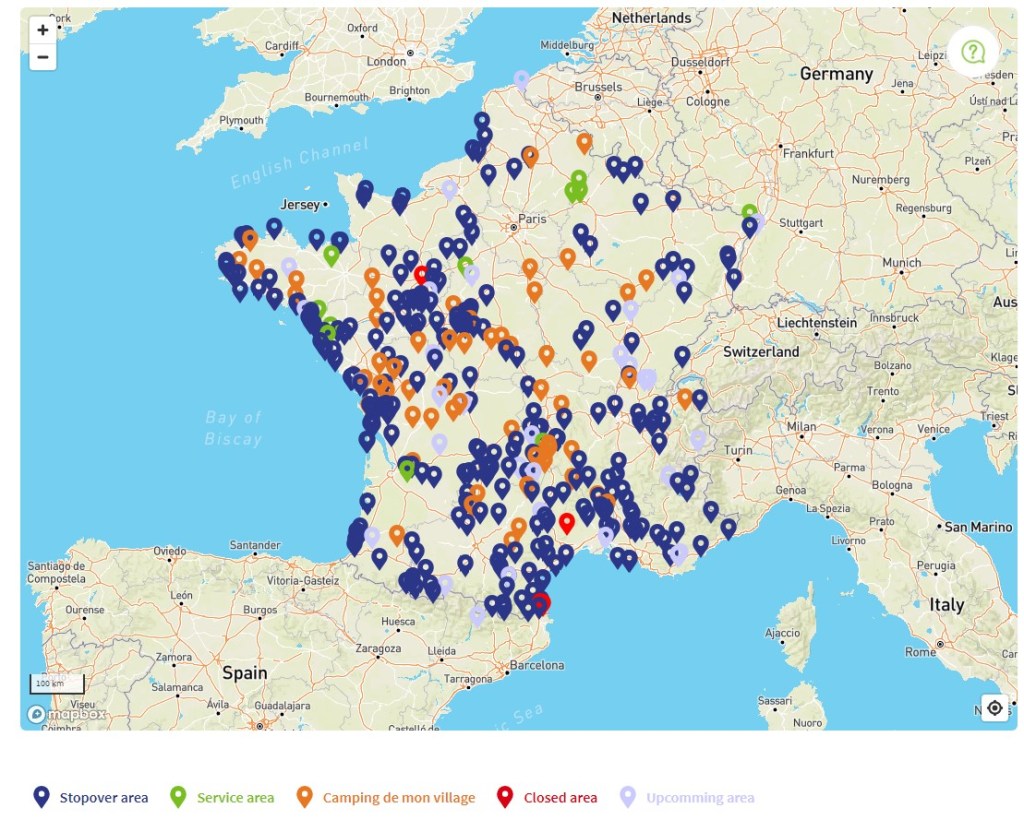 Ve Francii existuje dostatek Aires, neboli stání pro obytné vozy. Více jak v případě kempů jsou sdruženy do řetězců, ale některé obce upřednostňují správu svých obslužných oblastí samy. Řetězce nabízejí sjednocenost vybavení, stejný přístup i jednotnou podporu v případě problému.