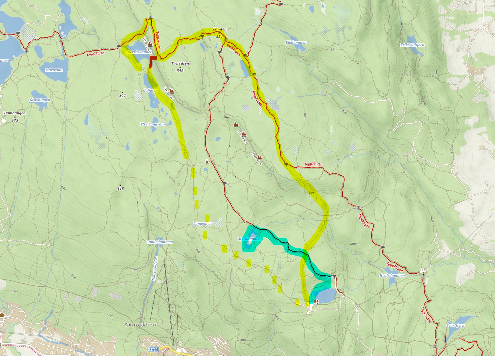 Z parkoviště po “značené” červené trase vede příjemná mírně náročná cesta až k jezeru Myrdammen, které se nachází severozápadně od parkoviště. Cestu k jezeru lze absolvovat i s kočárkem, ale musí se nejdříve přejít na druhou stranu jezera a poté se vydat po šotolinové cestě po červené značce až k jezeru, čímž se trasa protáhne o cca 2 km. (trasa z parkoviště je 1 km pro kočárky neschůdná)